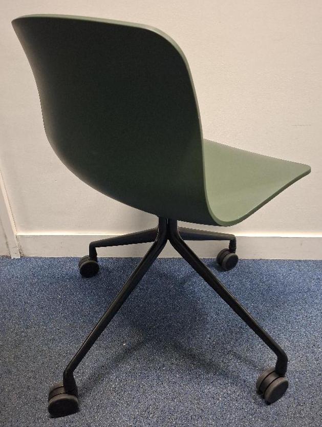 Chaise pivotante sur roulettes de marque Hay, coque en polypropylène vert foncé, piétement en étoile à 4 branches en acier laqué noir. 78 x 50 x 54 cm. 2 unités. Vendu à l’unité avec faculté de réunion. Localisation: Tour Coeur Défense – 92400 Courbevoie (TA 26ème).