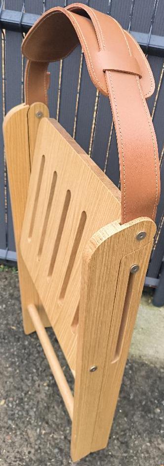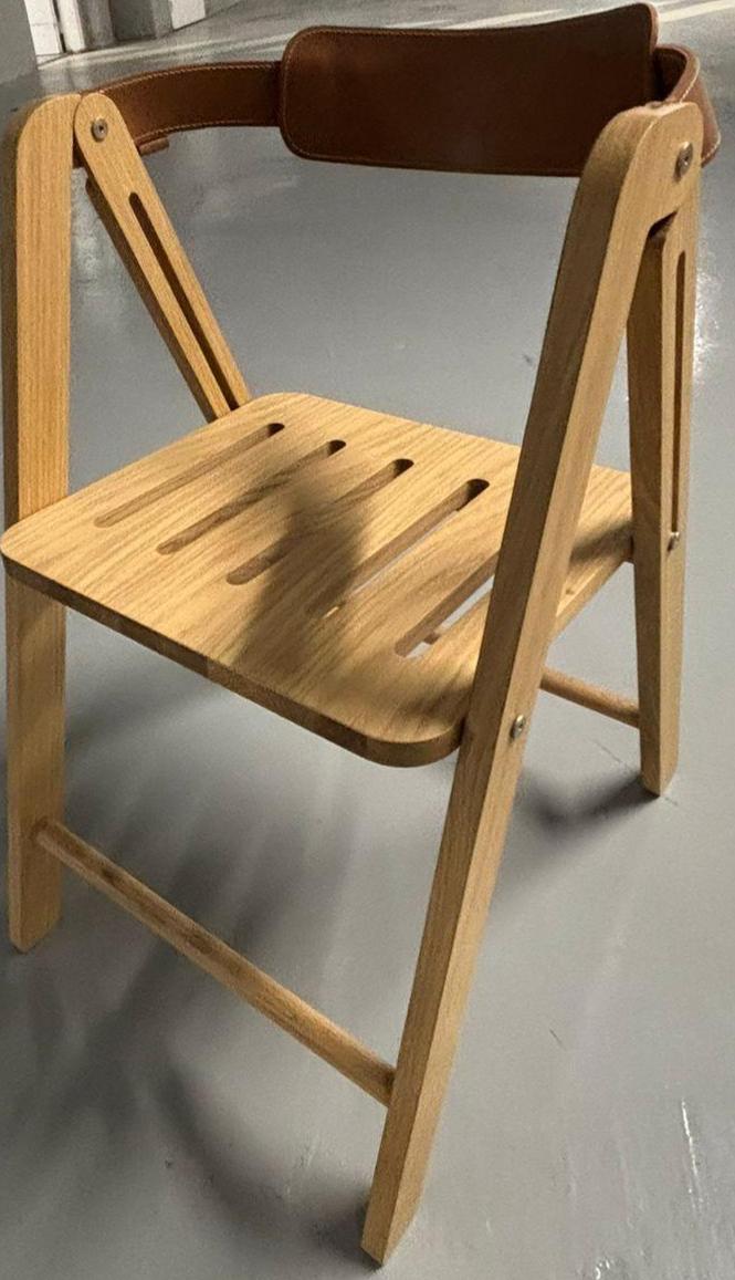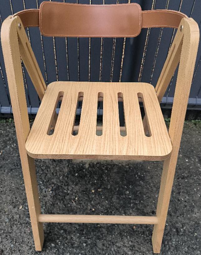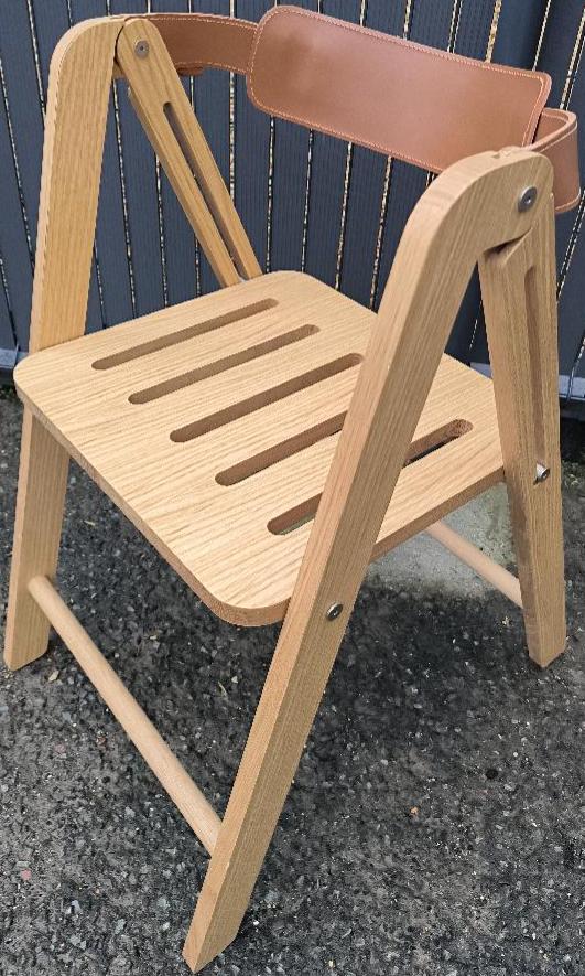 Chaise pliante de marque Ondarreta modèle Ika, structure en bois de chêne teinté naturel, dossier sangle en cuir camel. 79 x 46 x 59 cm. 15 unités. Vendu à l’unité avec faculté de réunion. Localisation : 30 rue Beauregard 60440 Nanteuil-le-Haudouin.
