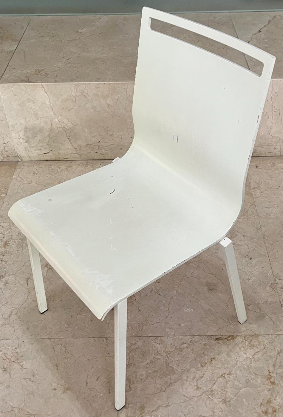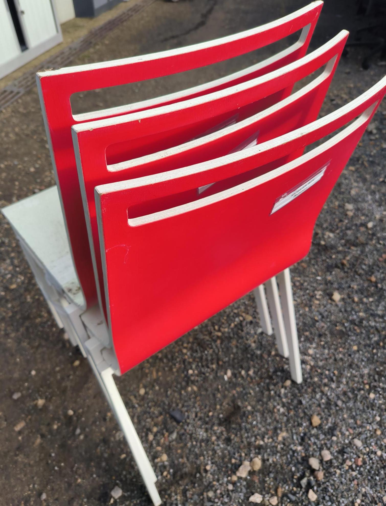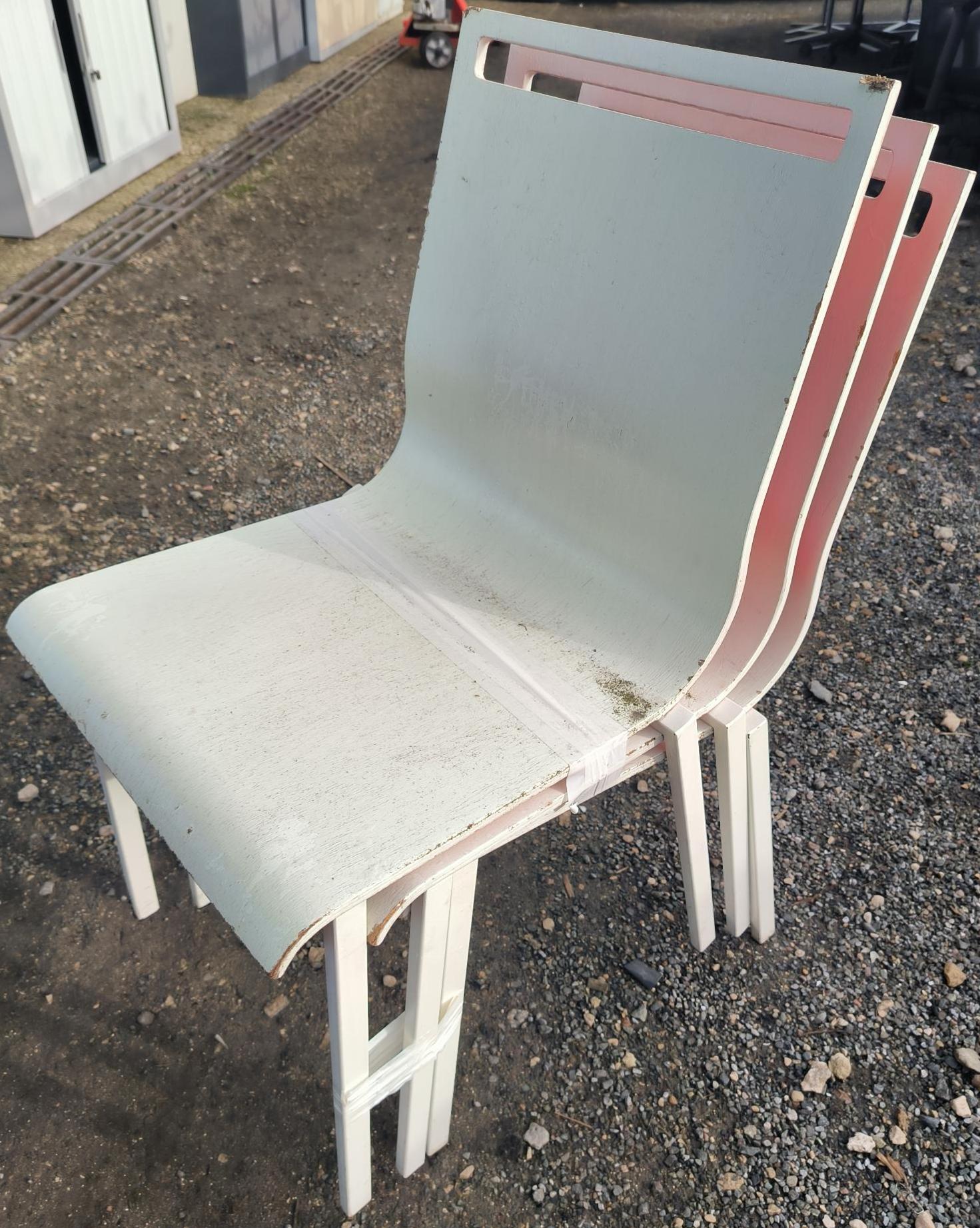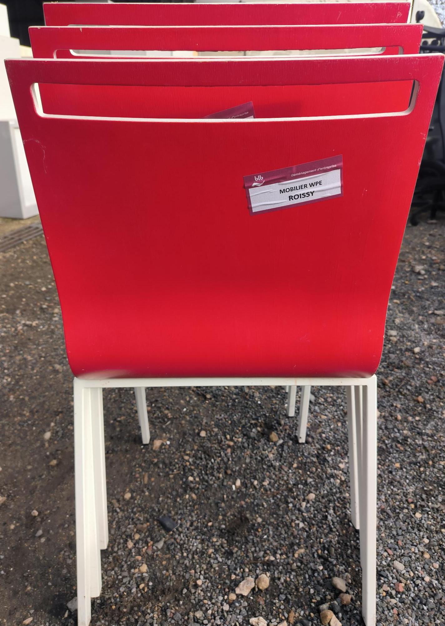 Chaise RIE en bois blanc et dos rouge (usures). Dim : 84x42x44 cm. 172 unités. Vendu à l’unité avec faculté de réunion. Localisation: 30 rue Beauregard 60440 Nanteuil-le-Haudouin.
