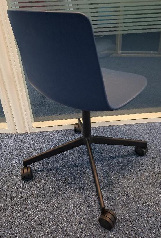 Chaise sur roulettes de marque Enea, coque en polypropylène bleu marine, piètement en étoile à 4 branches en acier laqué noir. 77 x 46 x 51 cm. Localisation: Tour Coeur Défense – 92400 Courbevoie (TA 26ème)
