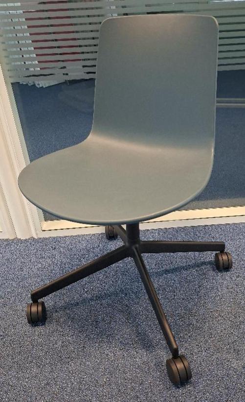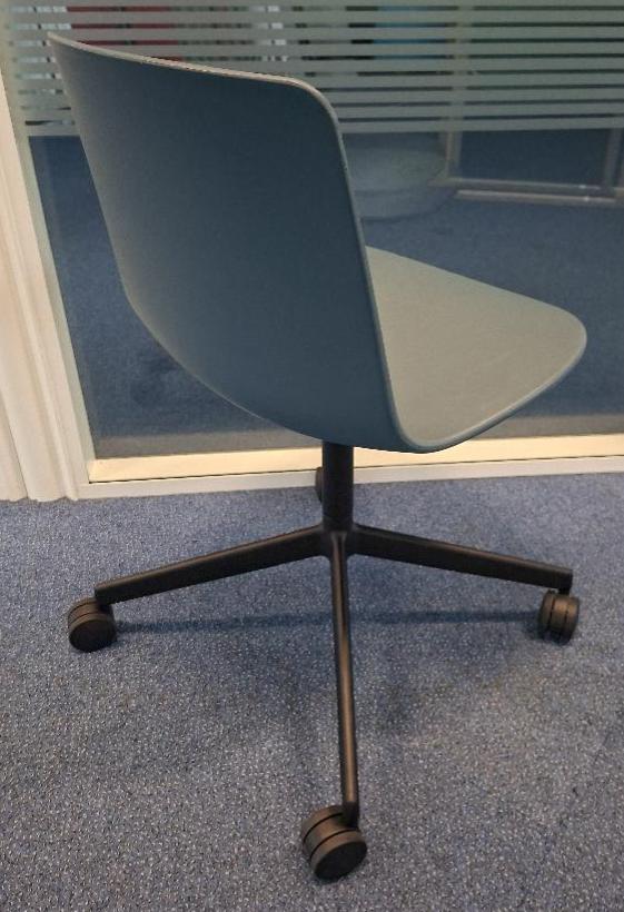 Chaise sur roulettes de marque Enea, coque en polypropylène vert bouteille, piètement en étoile à 4 branches en acier laqué noir. 77 x 46 x 51 cm. 2 unités. Vendu à l’unité avec faculté de réunion. Localisation: Tour Coeur Défense – 92400 Courbevoie (TA 26ème)
