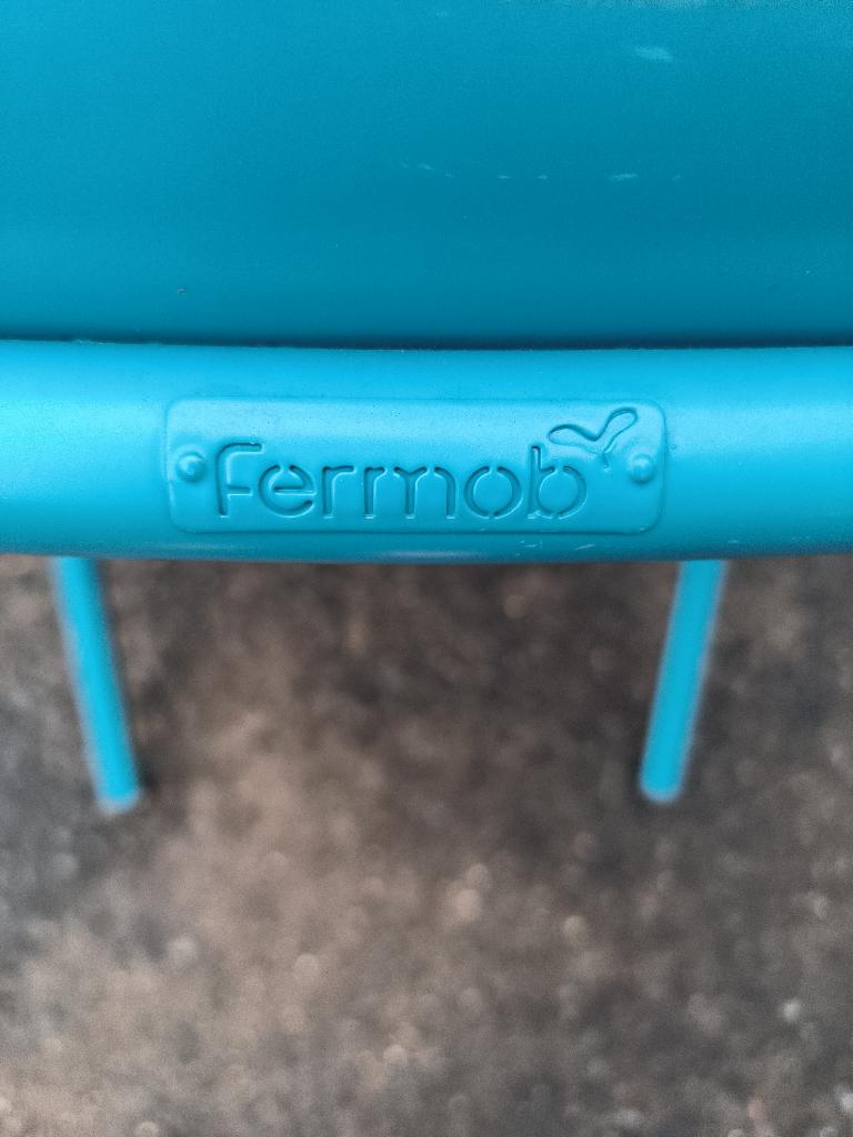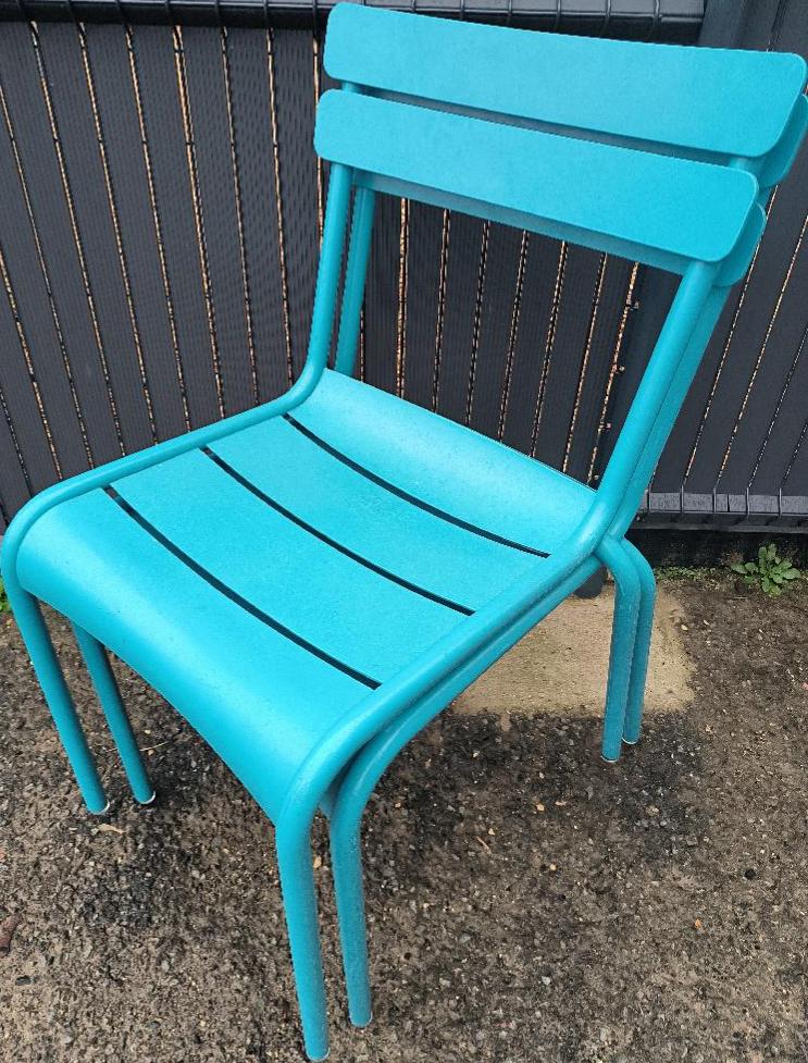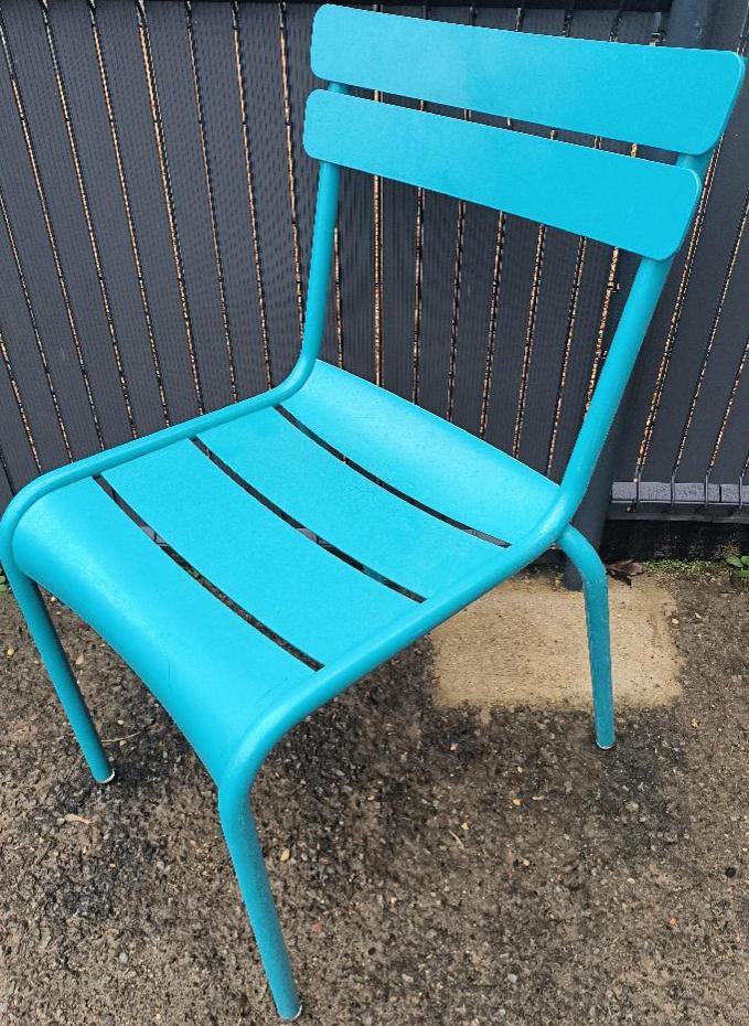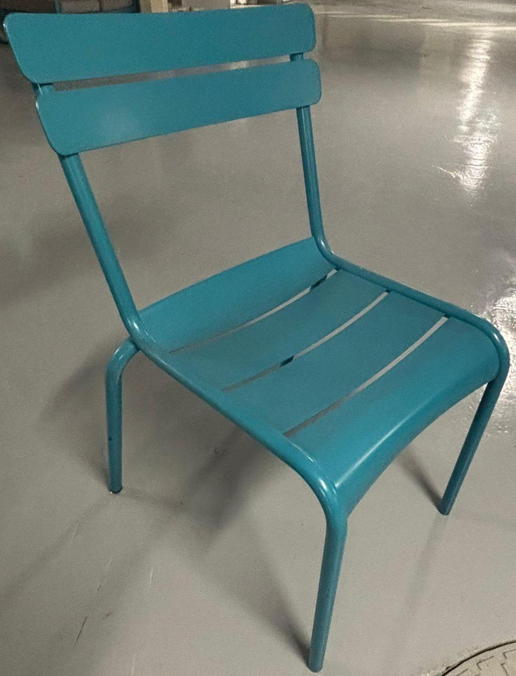 Chaises extérieur empilables design Frédéric Sofia modèle Luxembourg édition Fermob, dossier et assise galbée en aluminium de couleur bleu, patins silence. 88 x 52 x 57 cm. 20 unités. Vendu à l’unité avec faculté de réunion. Localisation : 30 rue Beauregard 60440 Nanteuil-le-Haudouin