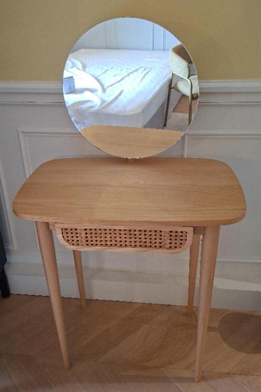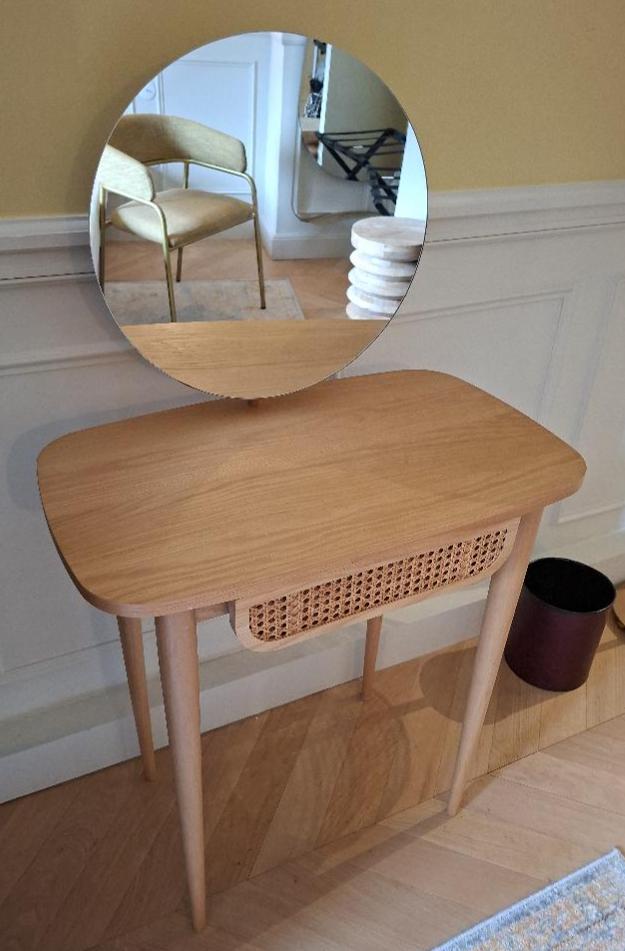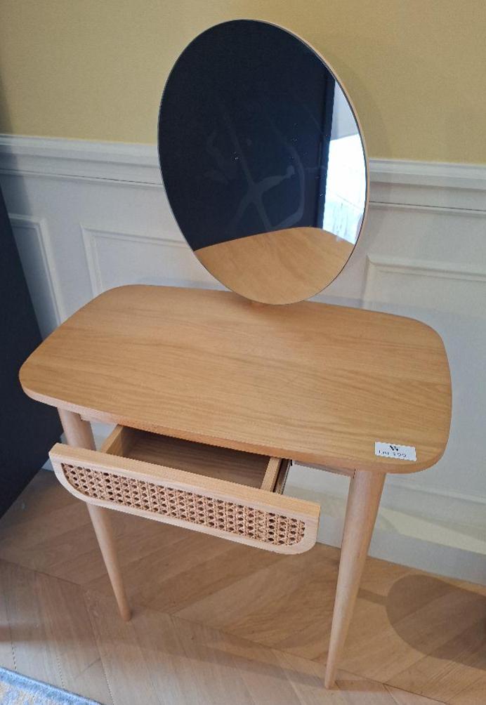 Coiffeuse en bois clair avec miroir rotatif, 1 tiroir en ceinture. 123 x 70 x 42 cm. 3 unités. Vendu à l’unité avec faculté de réunion. Localisation: BLB, 3 rue de la Fossé aux Leux – 91700 Sainte Geneviève des Bois