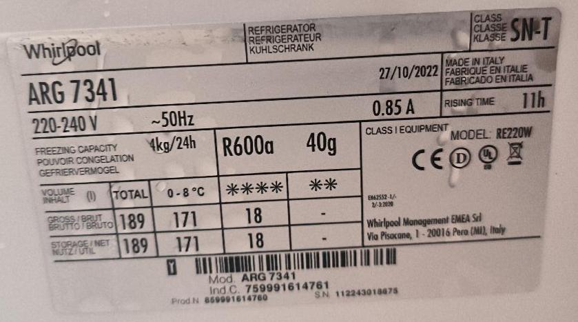 Combiné réfrigérateur congélateur encastrable de marque Whirlpool modèle ARG7341, capacité 189 litres. Dim : 82 x 54 x 53 cm. Localisation : 34 avenue du Général Patton 02880 Crouy