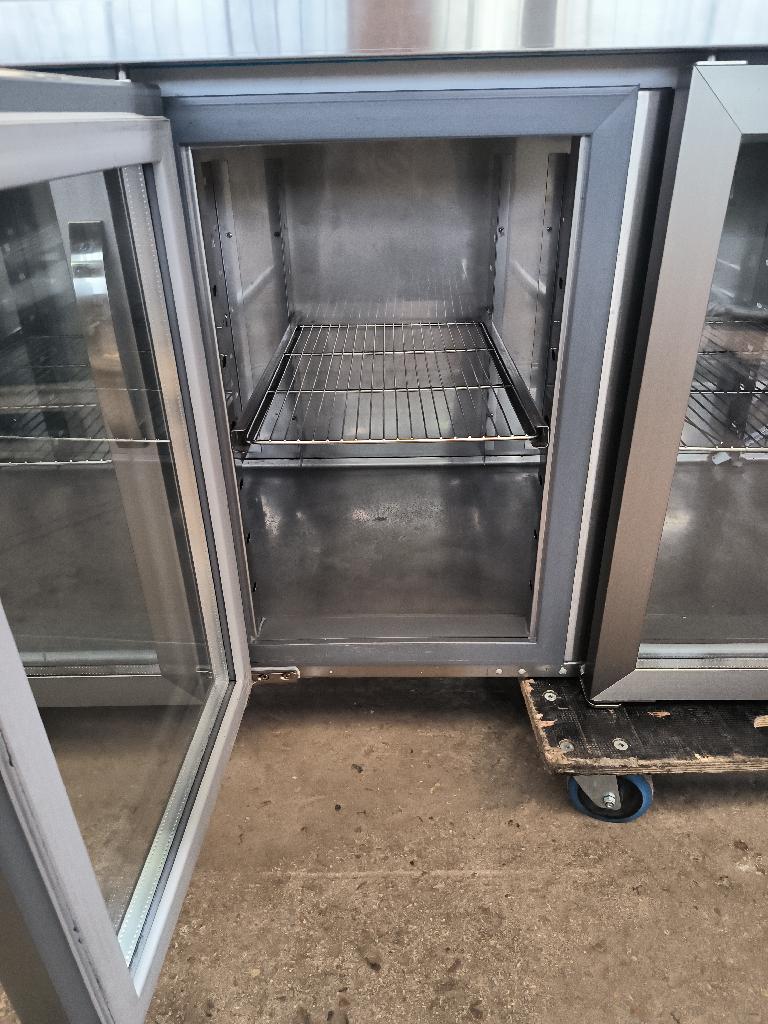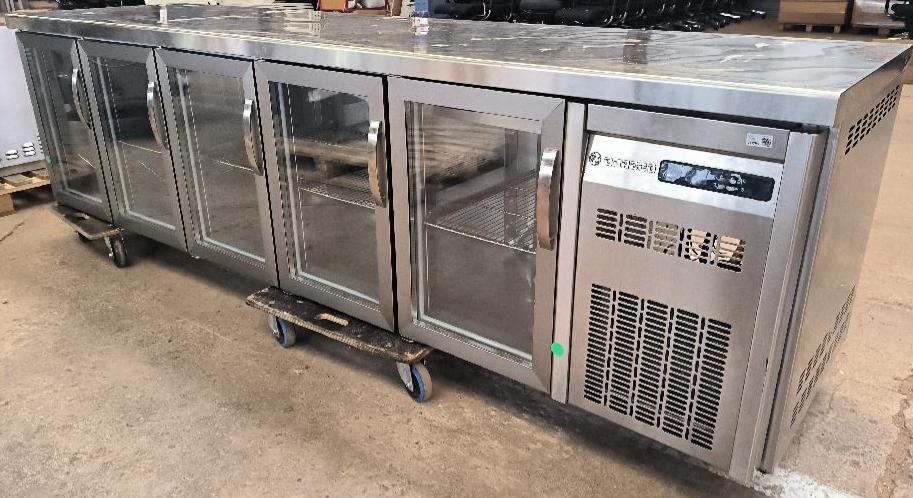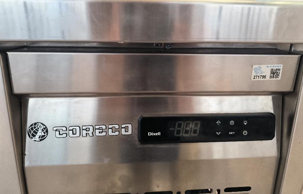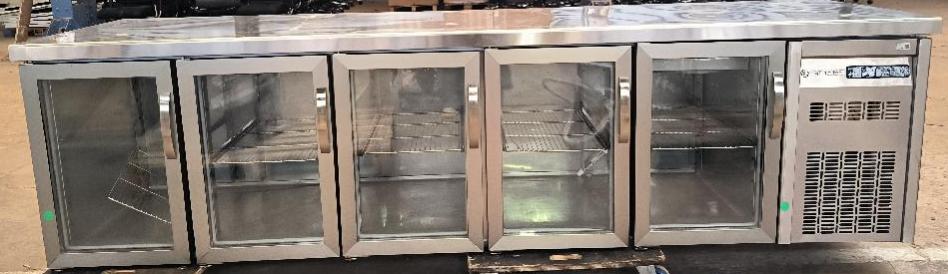 Comptoir réfrigéré à 5 portes vitrées de marque Coreco modèle MRGV-300. Dim : 85 x 270 x 70 cm. Localisation : 34 avenue du Général Patton 02880 Crouy
