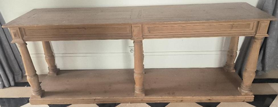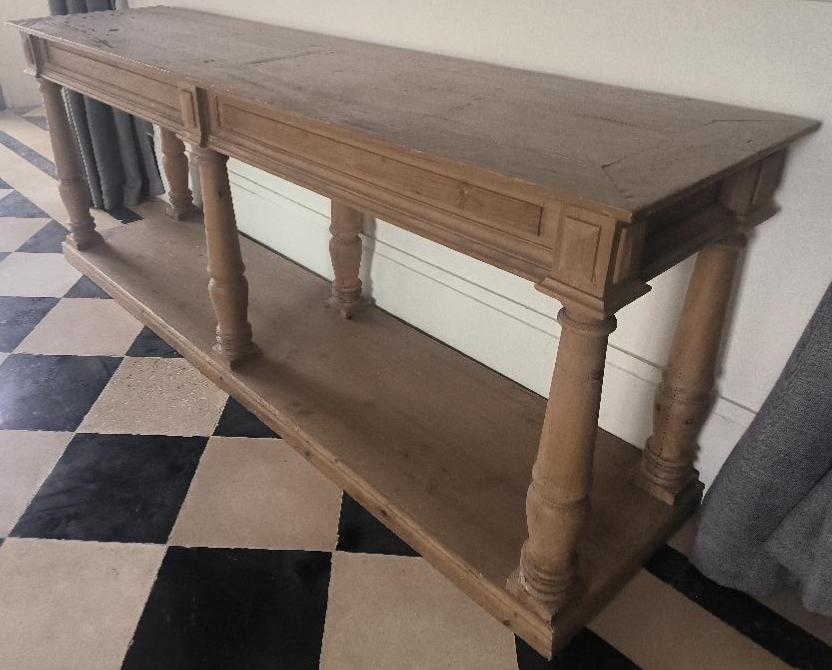 Console de marque Maisons du Monde modèle Mahault en bois, pieds balustres. Dim : 76 x 200 x 50 cm. Localisation: BLB, 3 rue de la Fossé aux Leux – 91700 Sainte Geneviève des Bois