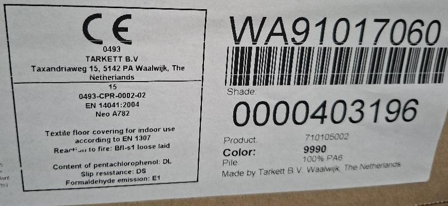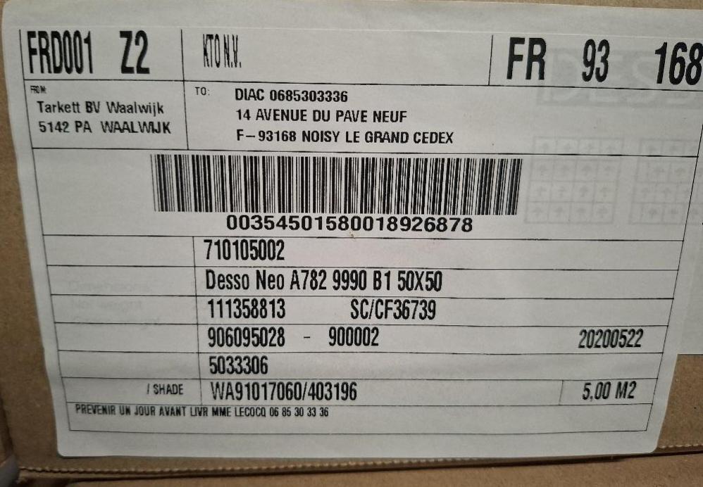 Dalle de moquette 50 x 50 cm de marque Desso modèle Néo, référence couleur 9990. 8 cartons de 5 m2 soit 40 m2. Localisation: -1