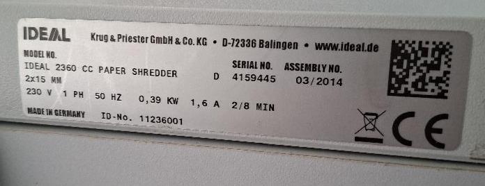 Destructeur de documents de marque Idéal modèle 2360. 69 x 38 x 30 cm. Localisation: Tour Coeur Défense - 92400 Courbevoie (TA 26ème)