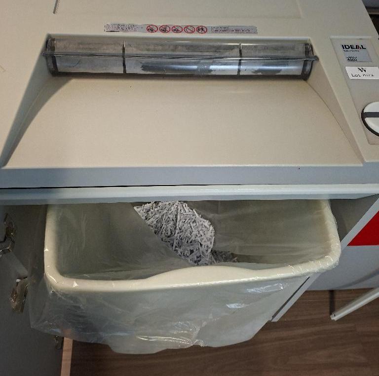 Destructeur de documents de marque Idéal modèle 4002. 95 x 64 x 59 cm. 9 unités. Vendu à l’unité avec faculté de réunion. Localisation: Tour Coeur Défense – 92400 Courbevoie (TA25; 5 unités / TB5 7ème: 1 / TB5 4ème: 1 / TB5 3ème: 1 / TB4 0 : 1)