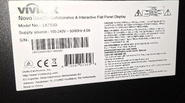 Ecran tactile intéractif 75 pouces de marque Vivitek modèle Novotouch LK7530i, vendu avec une barre de son vidéo de marque Aver modèle VB342. Localisation: Tour Coeur Défense – 92400 Courbevoie (TA cafet)