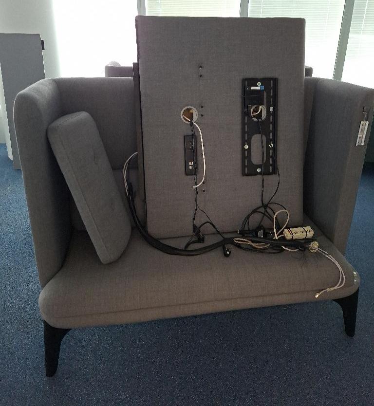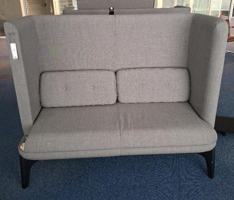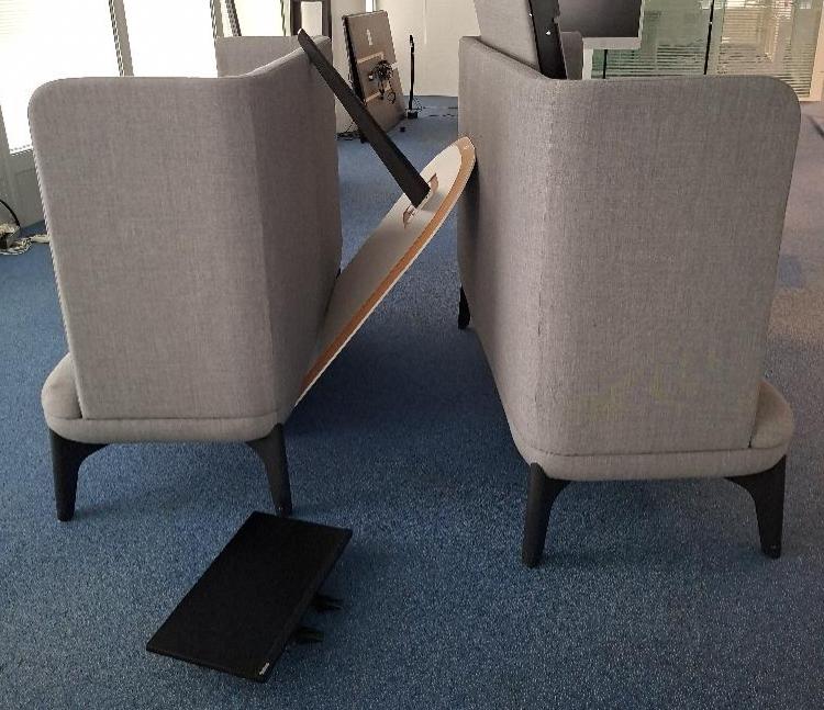 Espace de réunion 4 personnes de marque OrangeBox modèle Coze-W03, comprenant 2 banquettes recouvertes de tissu gris clair, 1 table haute et 1 emplacement pour écran avec prises électriques intégrées. Dim banquette: 128 x 156 x 68 cm. Localisation: Tour Coeur Défense – 92400 Courbevoie (TA 26ème démontée)