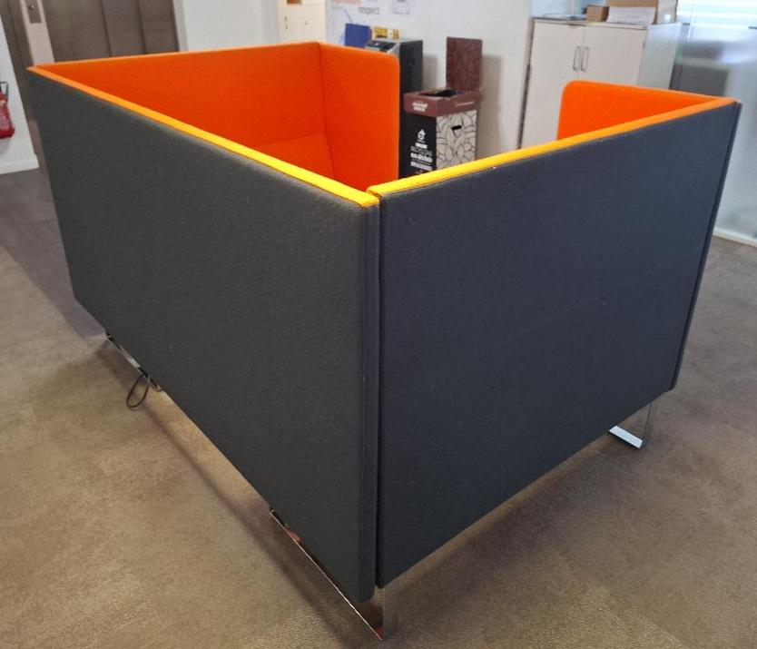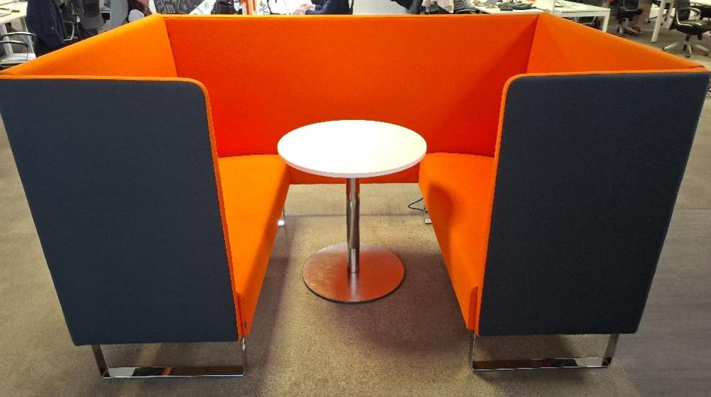 Espace de travail acoustique de marque Materia comprenant 2 banquettes en feutrine orange, arrière des dossiers gris anthracite. piétement en acier chromé. 123 x 138 x 205 cm. On y joint une table ronde à plateau en bois stratifié blanc (diamètre 70 cm). Localisation: 26 rue Cambaceres – 75008 Paris. (3eme étage)