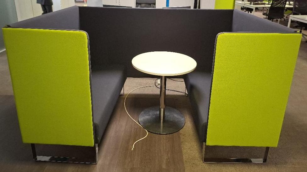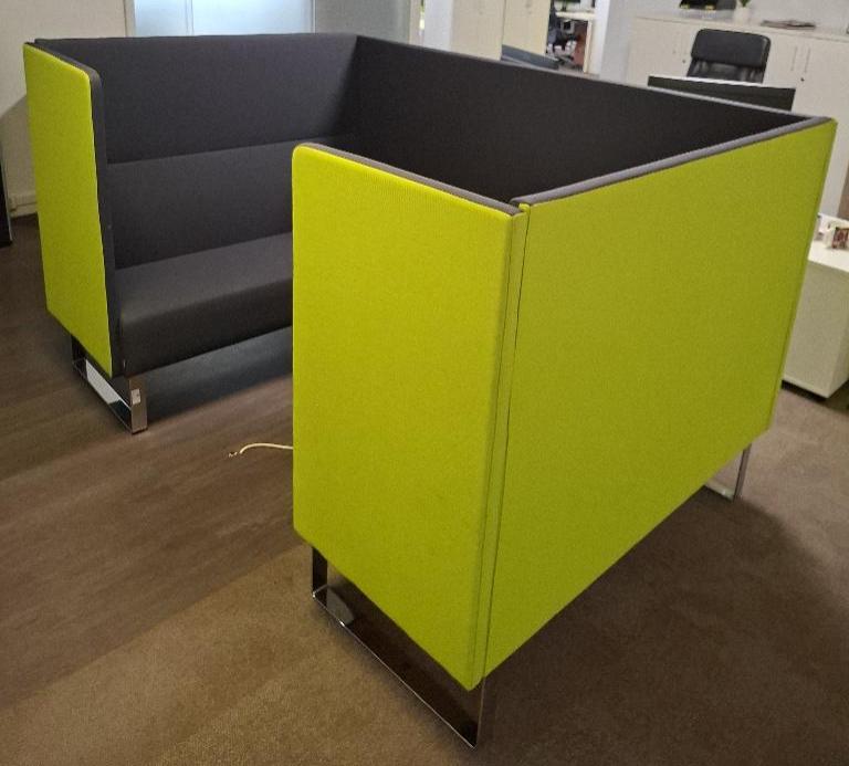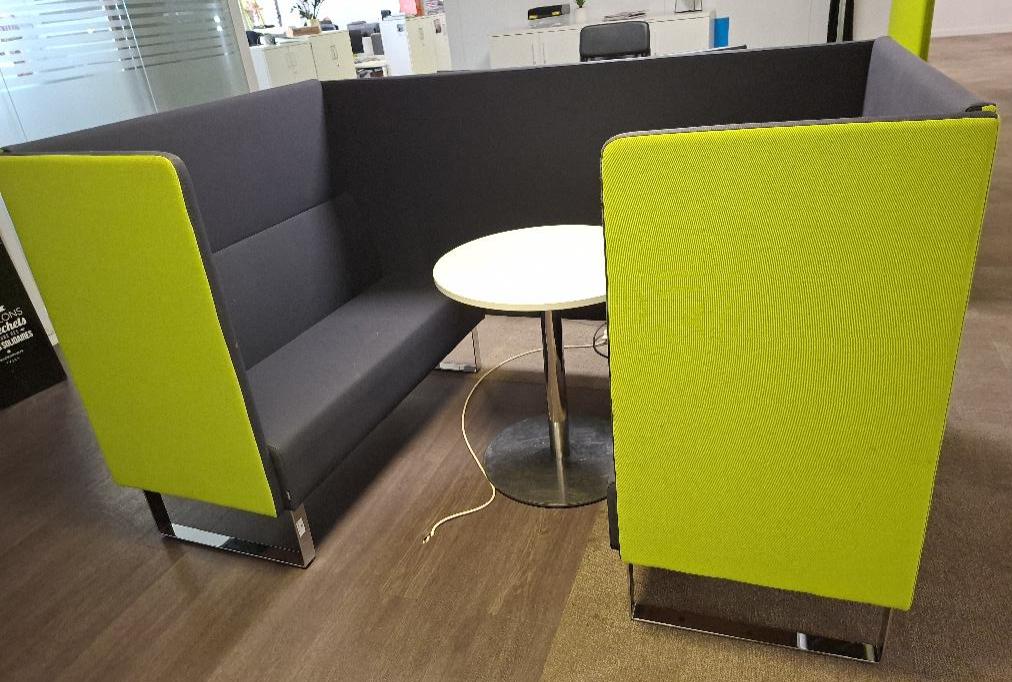Espace de travail acoustique de marque Materia comprenant 2 banquettes en tissu gris anthracite, arrière des dossiers vert pomme. piétement en acier chromé. 123 x 138 x 205 cm. On y joint une table ronde à plateau en bois stratifié blanc (diamètre 70 cm). Localisation: 26 rue Cambaceres – 75008 Paris. (2eme étage)