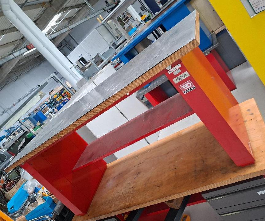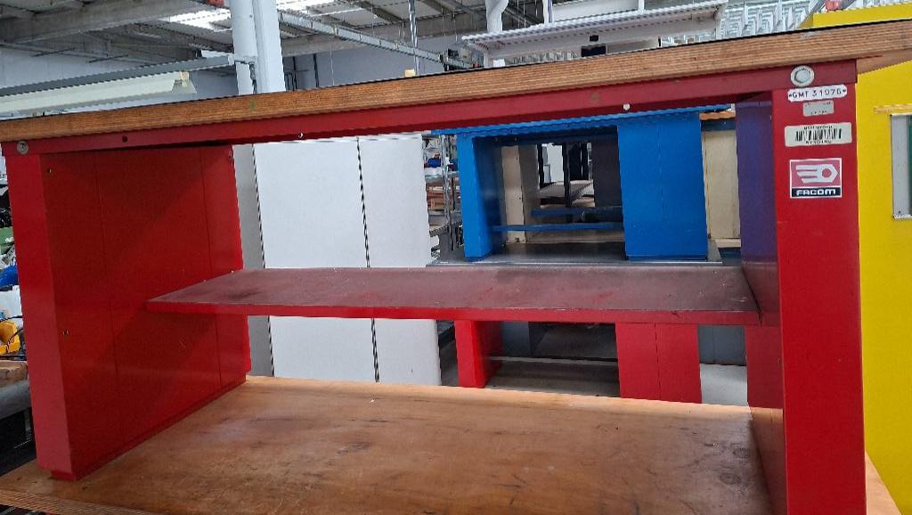 Etabli d'atelier de marque Facom en acier laqué rouge, plateau recouvert d'une plaque en inox. 88 x 200 x 75 cm. – Image 2
