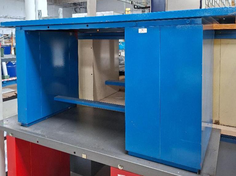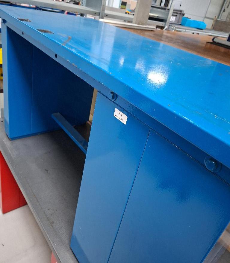 Etabli d’atelier en acier laqué bleu à 1 caisson ouvrant à 4 tiroirs. 87 x 175 x 75 cm.