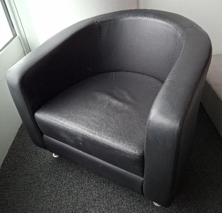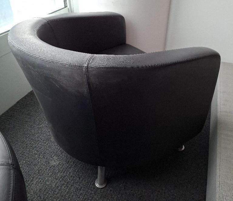 Fauteuil crapaud de marque Boss Design modèle Zoot Wub Chair recouvert de cuir noir reposant sur 4 pieds droits en acier chromé. 68 x 78 x 64 cm. 4 unités. Vendu à l’unité avec faculté de réunion. Localisation: Tour Coeur Défense – 92400 Courbevoie (TA 25ème)