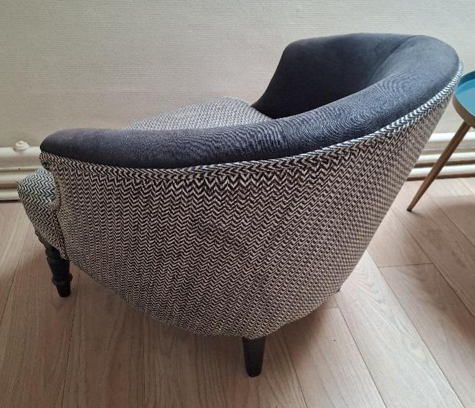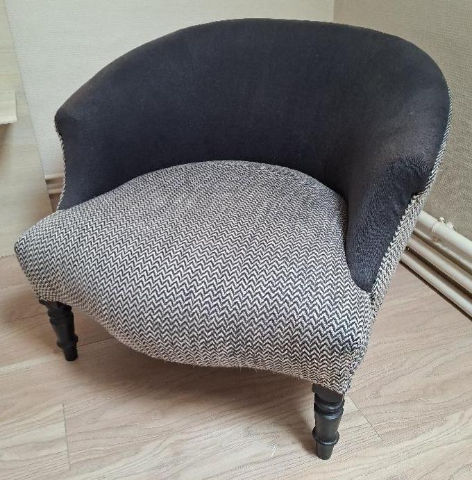 Fauteuil crapaud recouvert de tissu noir et blanc, pieds en bois noirci. 65 x 76 x 78 cm. Localisation: BLB, 3 rue de la Fossé aux Leux – 91700 Sainte Geneviève des Bois