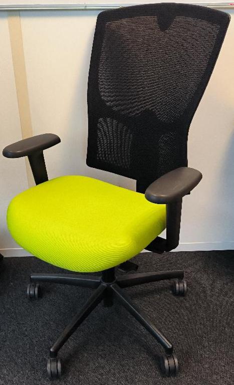 Fauteuil de bureau sur roulettes de marque Kinnarps modèle Drabert, dossier en tissu résille de couleur noir, assise en tissu de couleur vert pomme. Dim : 110 x 63 x 60 cm. 238 UNITÉS AU TOTAL. (étiquette 5017)