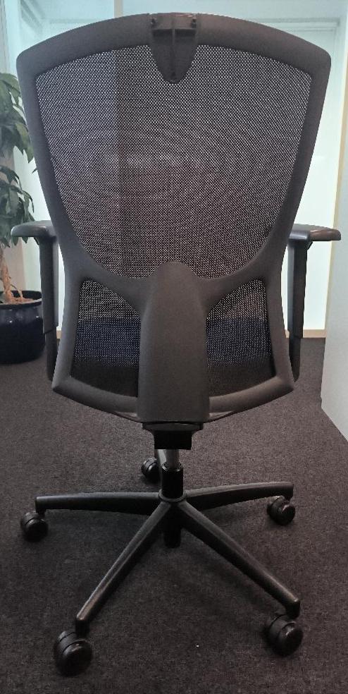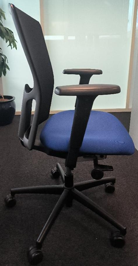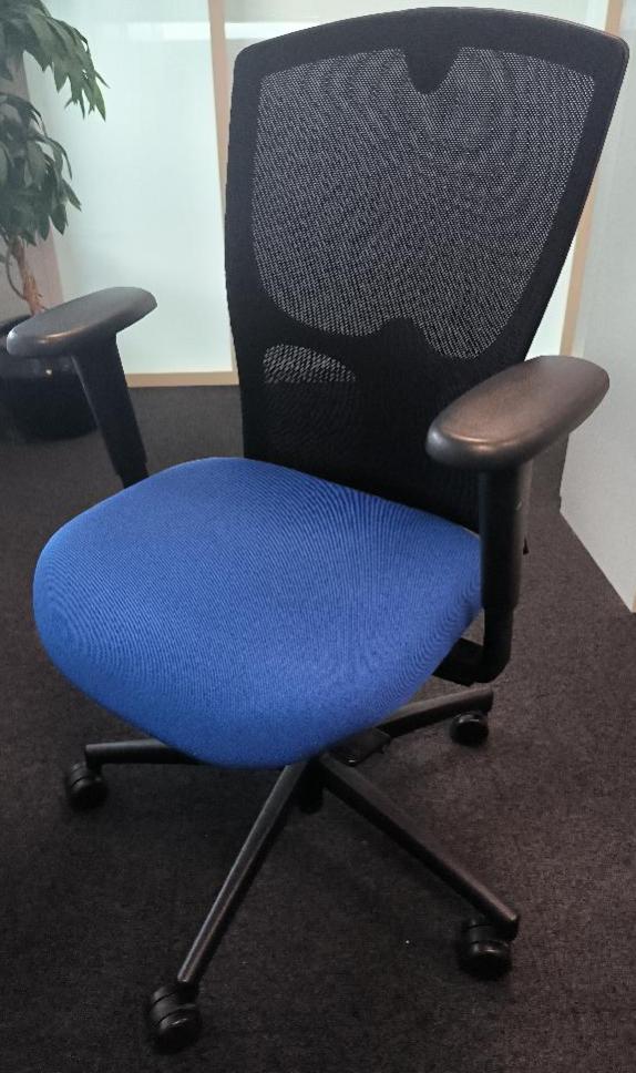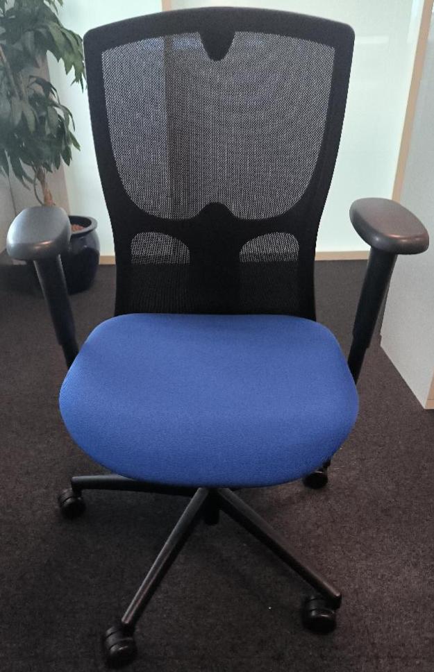 Fauteuil de bureau sur roulettes de marque Kinnarps modèle Mento, dossier en tissu résille de couleur noir, assise en tissu de couleur bleu électrique. Dim : 100 x 65 x 70 cm. (étiquette 5020)