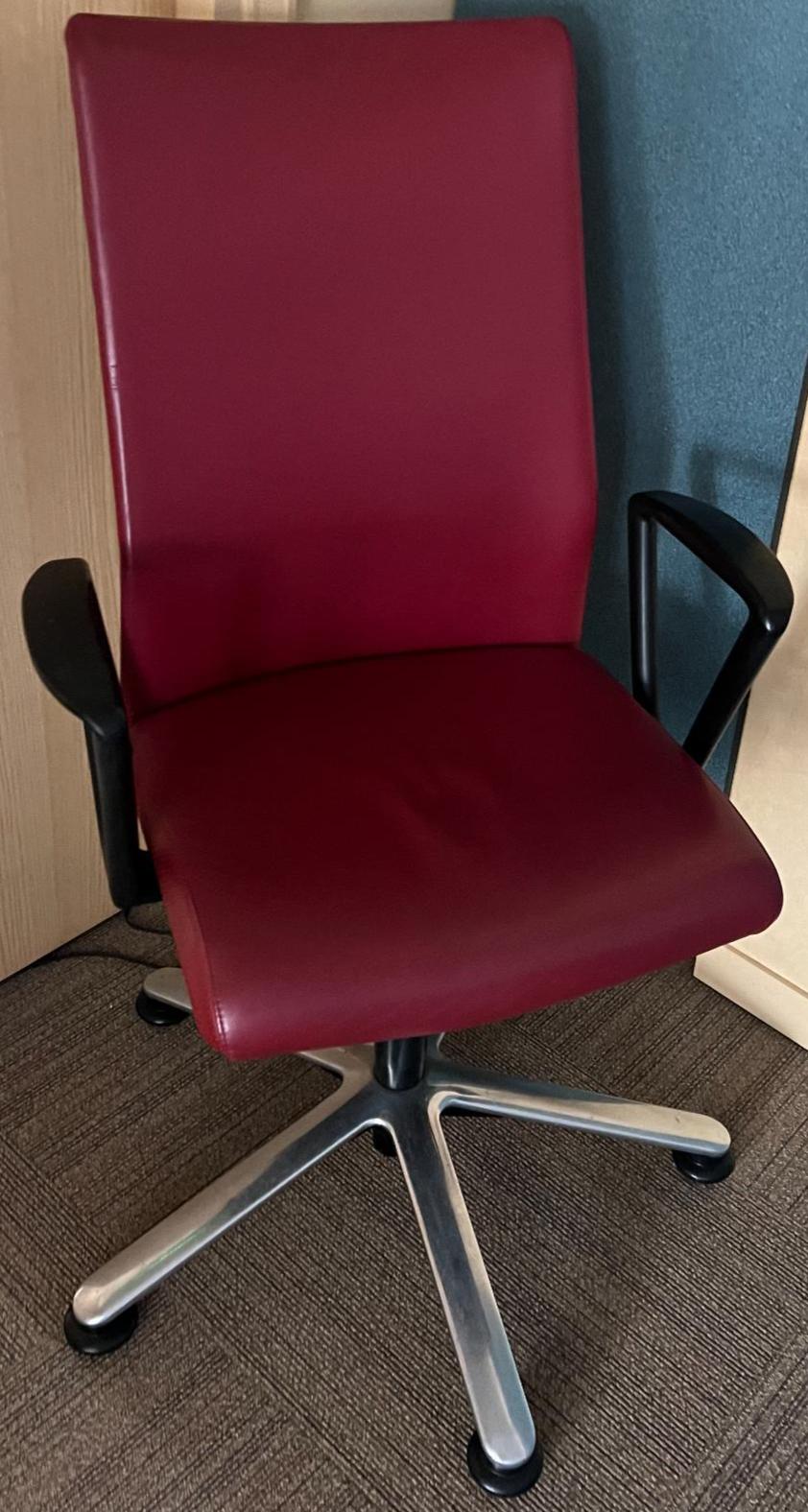 Fauteuil de bureau sur roulettes en cuir rouge, accoudoirs couleur noir, piètement à 5 branches en acier chromé. 28 unités. Vendu à l’unité avec faculté de réunion. Localisation: 30 rue Beauregard 60440 Nanteuil-le-Haudouin.