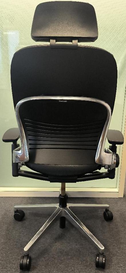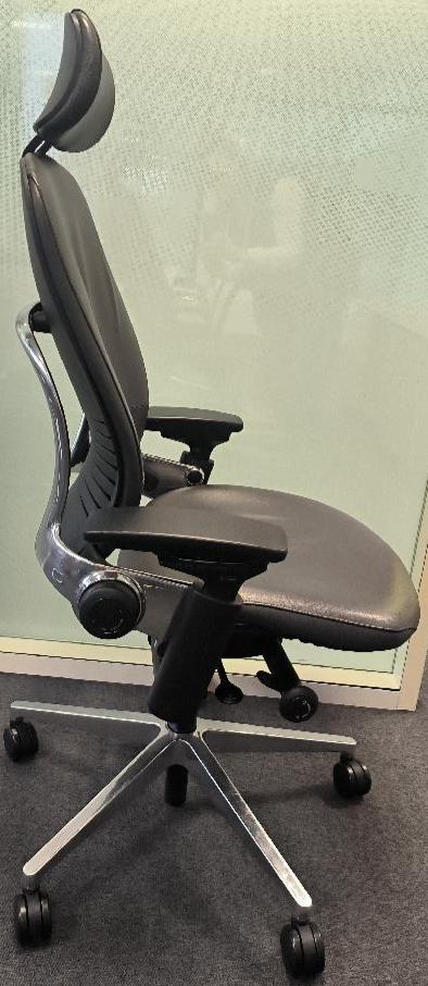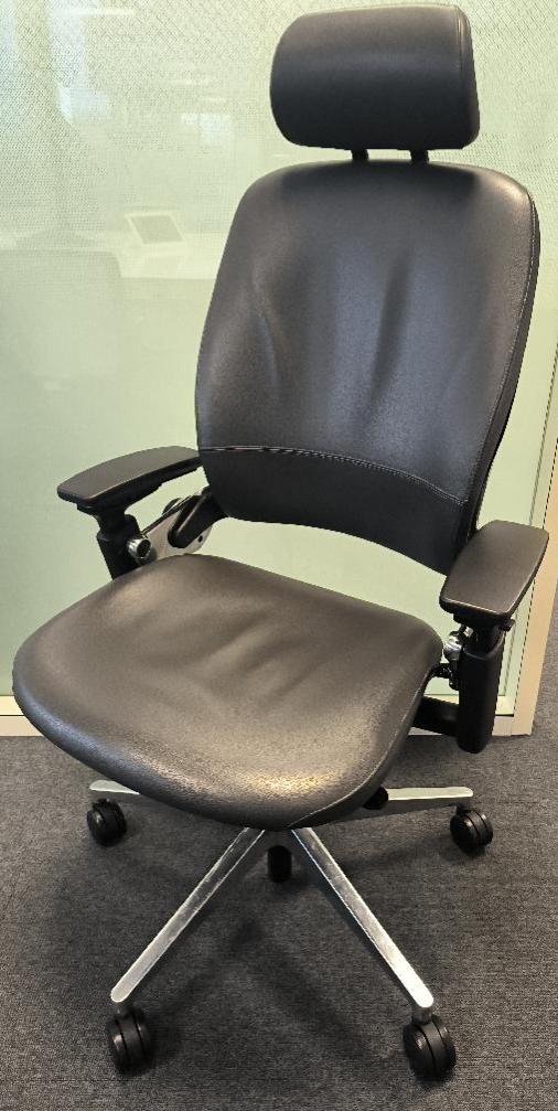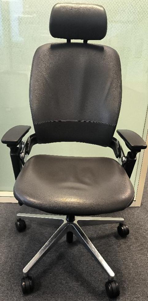 Fauteuil de direction de marque Steelcase, assise et dossier en cuir de couleur noir avec têtière, piétement étoile 5 branches en acier chromé. (très bon état). Dim : 130 x 66 x 72 cm. 1 UNITÉ AU TOTAL. (étiquette 5036)