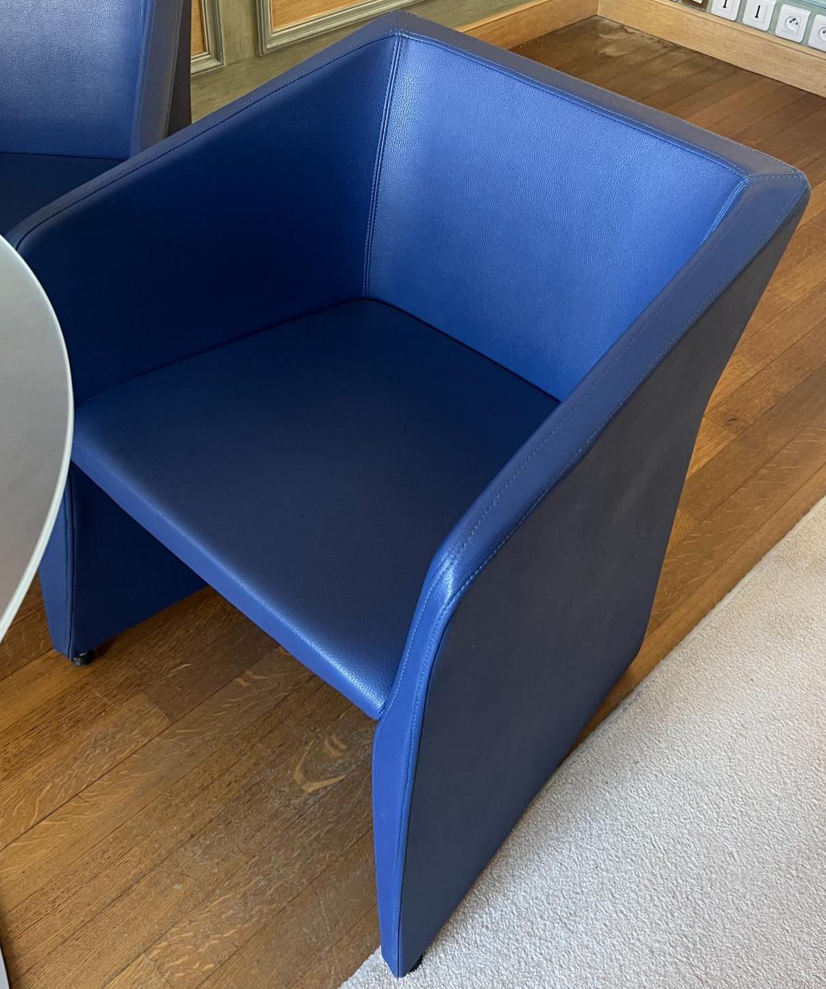 Fauteuil de marque Eurosit en cuir bleu. 2 unités. Vendu à l’unité avec faculté de réunion. Localisation: 30 rue Beauregard 60440 Nanteuil-le-Haudouin.