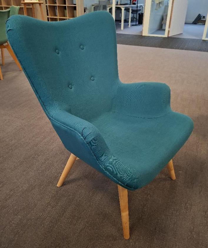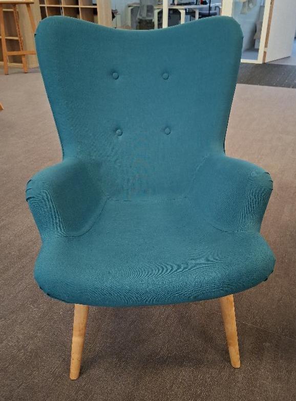 Fauteuil de marque Maisons du Monde recouvert de tissu vert canard, dossier capitonné, piétement en bois naturel. 90 x 66 x 70 cm. (3ème). Localisation: 10 rue d’Arcueil – 94150 Rungis
