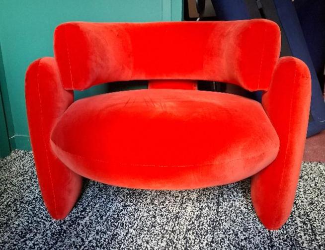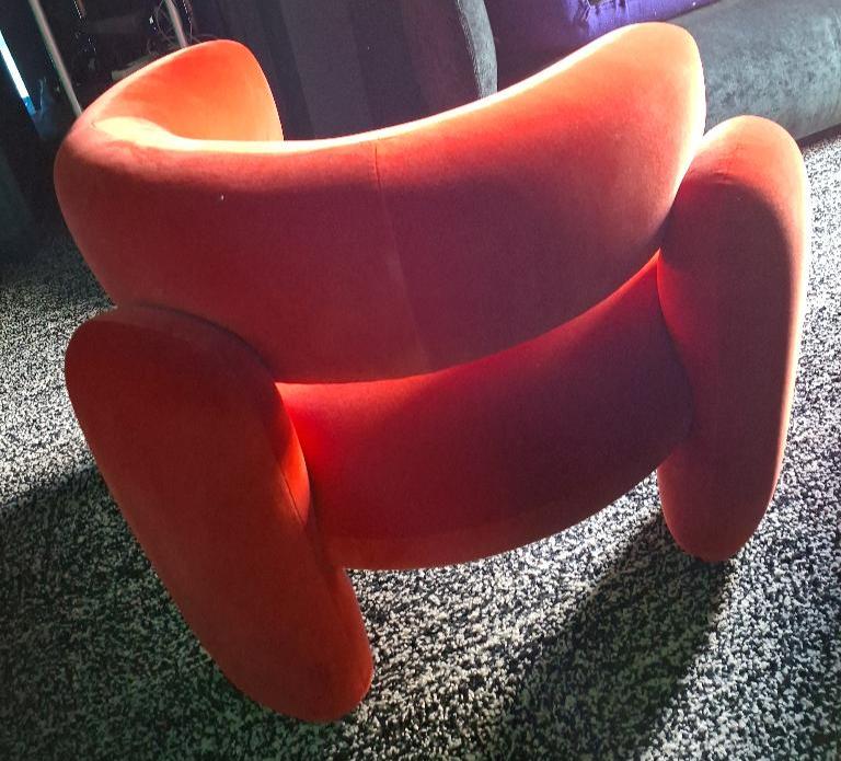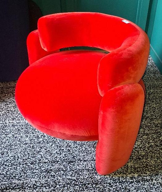 Fauteuil de marque Royal Stranger modèle Embrace recouvert de velours orange vif. 66 x 90 x 88 cm. Localisation: BLB, 3 rue de la Fossé aux Leux – 91700 Sainte Geneviève des Bois