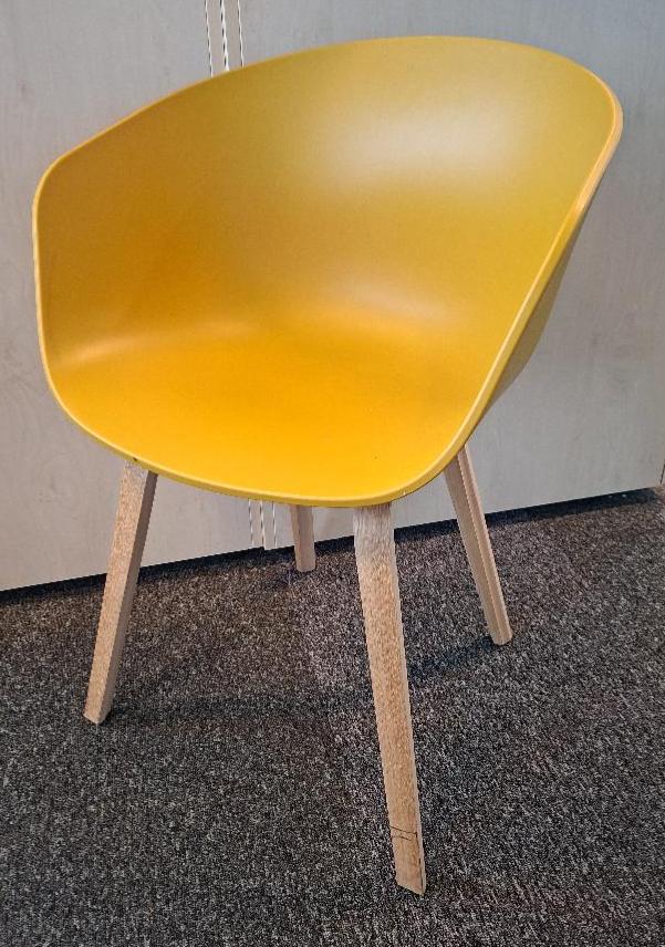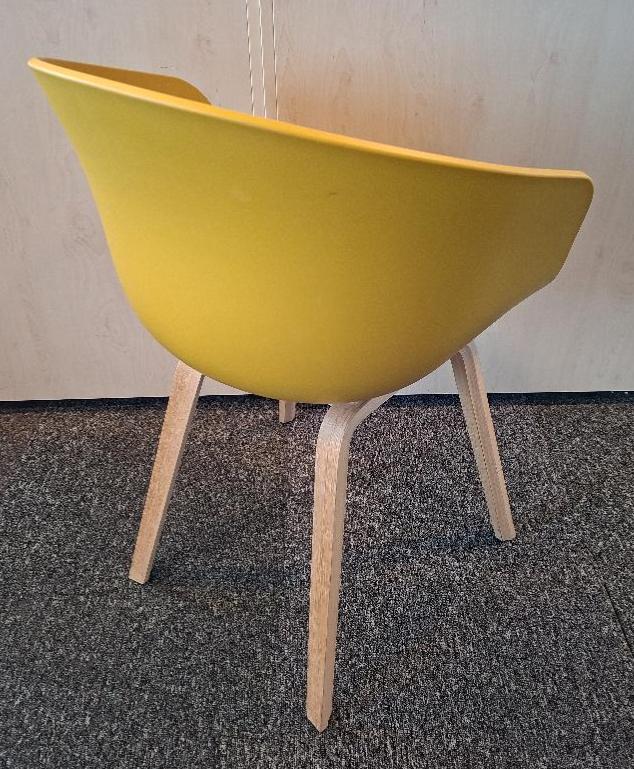 Fauteuil design Hee Welling modèle About A Chair édition Hay, coque en polypropylène jaune moutarde, piétement en bois naturel. 80 x 58 x 58 cm. 2 unités. Vendu à l’unité avec faculté de réunion. Localisation: 19 rue Neuve Tolbiac – 75013 Paris (8ème étage)