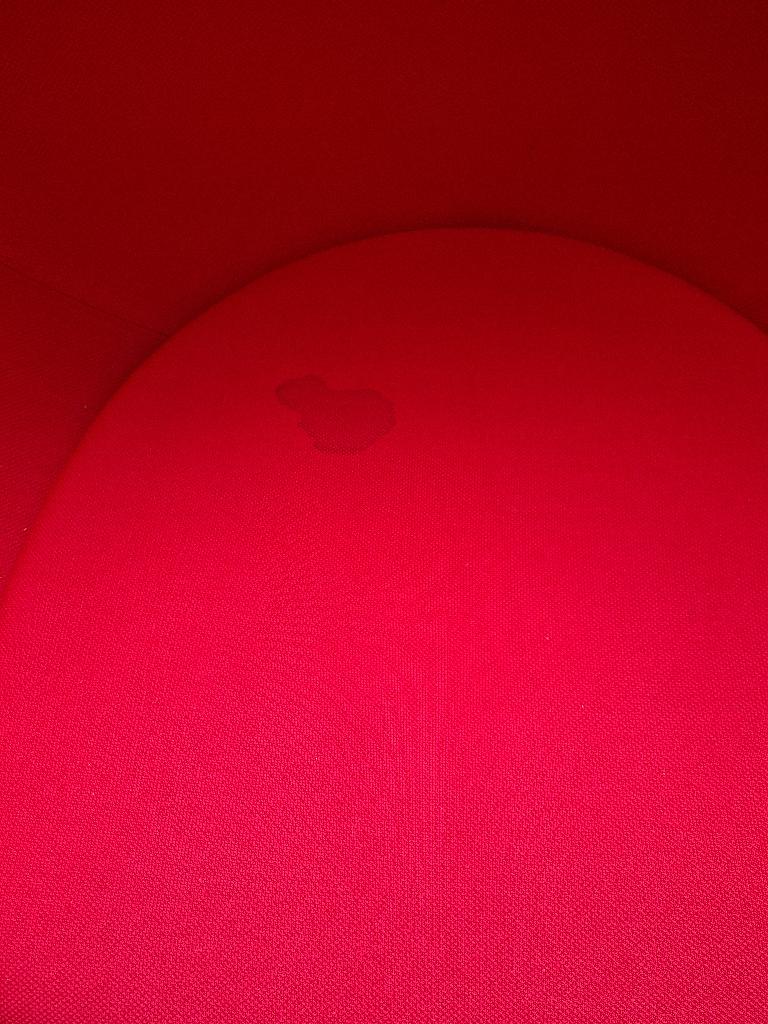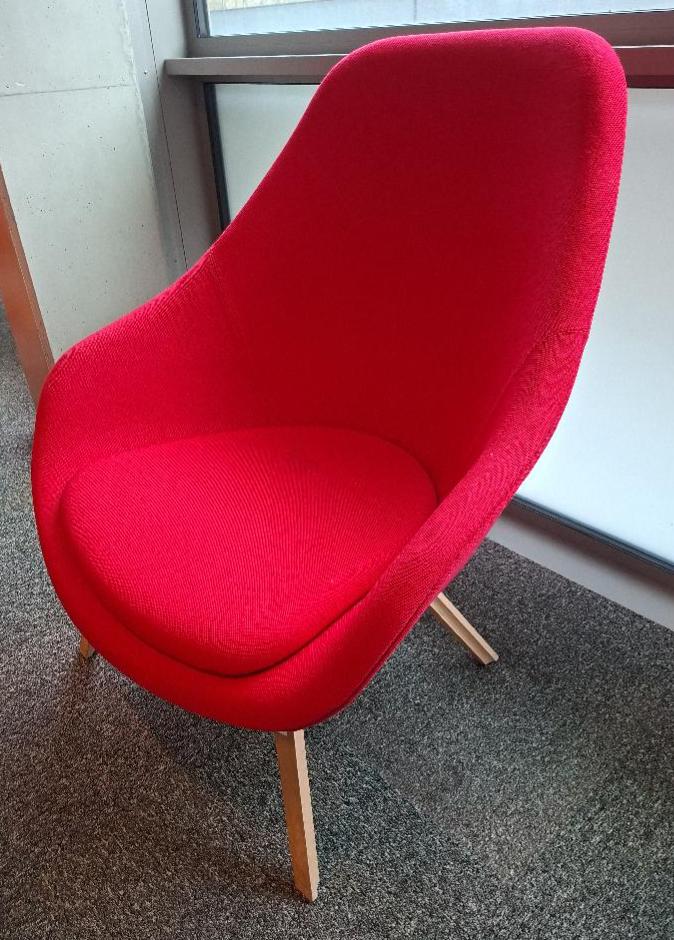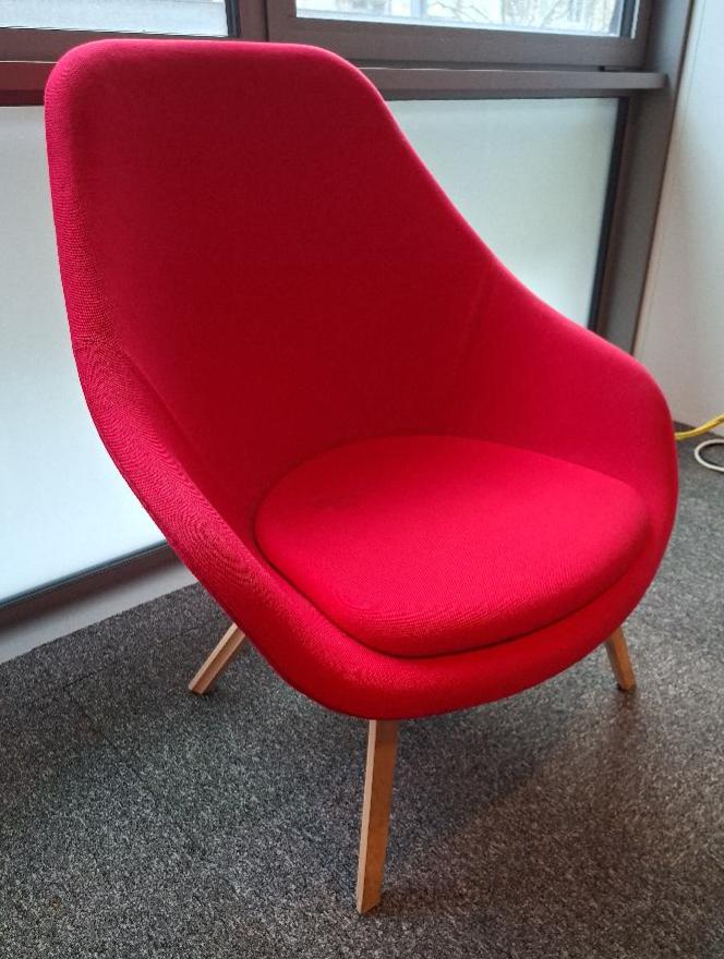 Fauteuil design Hee Welling modèle About A Lounge édition Hay, garniture en tissu rouge, galette d’assise à scratch, piétement en bois naturel. 103 x 90 x 86 cm. (tâche). Localisation: 19 rue Neuve Tolbiac – 75013 Paris (1er étage)