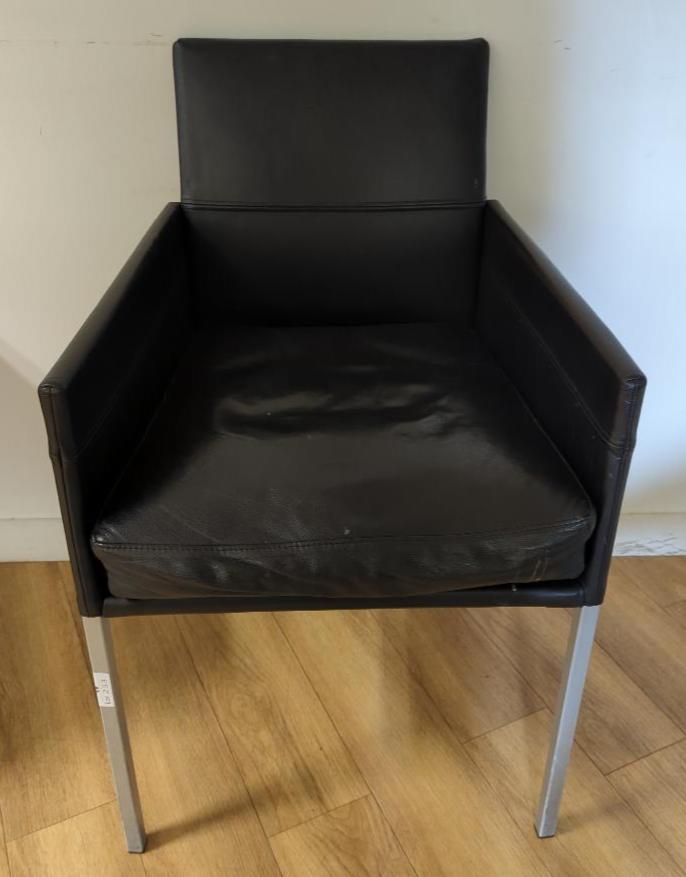 Fauteuil design Karl Friedrich Foster modèle Texas édition KFF recouvert de cuir noir, piètement en acier à section carrée, assise amovible. 86 x 53 x 53 cm.