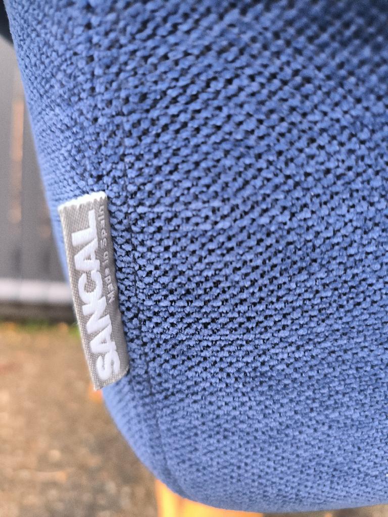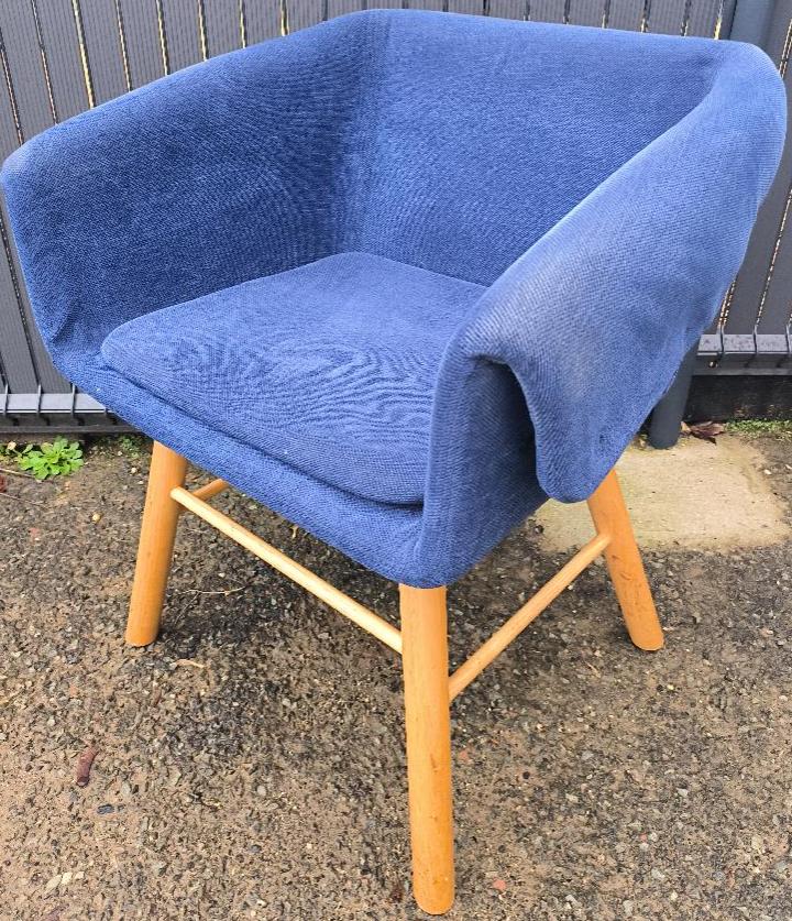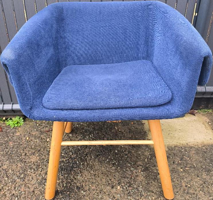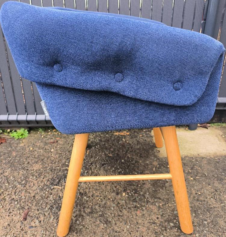 Fauteuil design Skrivo modèle Collar édition Sancal recouvert de tissu chiné bleu sur 4 pieds obliques avec repose pieds en bois naturel. 72 x 60 x 59 cm. 3 unités (dont 1 où il manque 2 boutons = 1 de chaque côté et 1 autre où il manque 2 boutons sur le même côté). Localisation : 30 rue Beauregard 60440 Nanteuil-le-Haudouin.