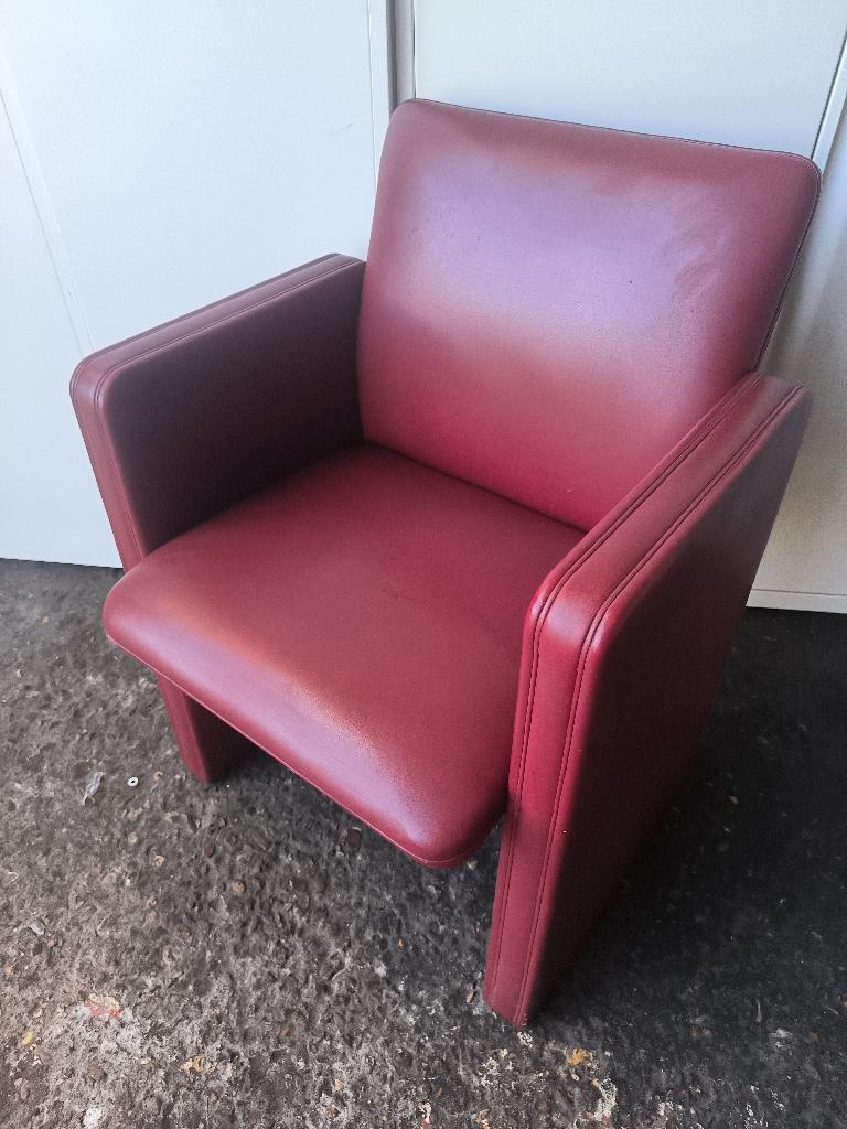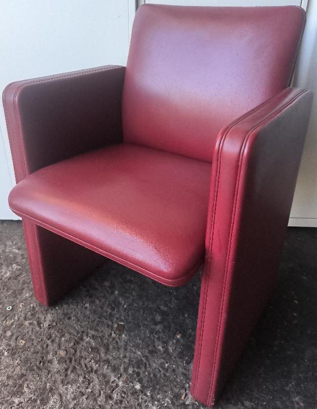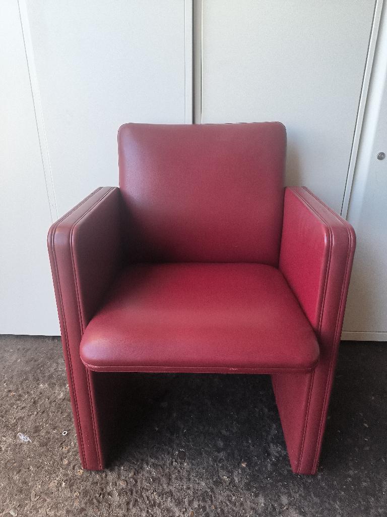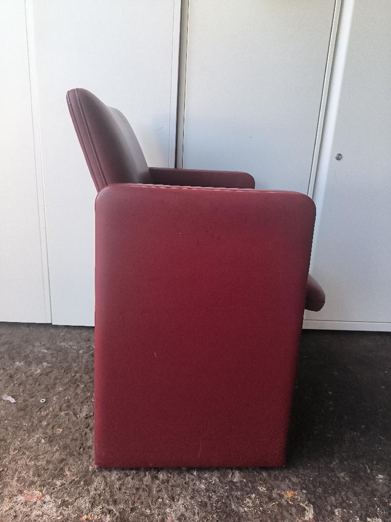 Fauteuil design Tito Agnoli modèle THF édition Poltrona Frau recouvert de cuir rouge amarante, piétement sur roulettes. Dim : 83 x 61 x 55 cm. 6 unités. Vendu à l’unité avec faculté de réunion. Localisation : 30 rue Beauregard – 60440 Nanteuil-le-Haudouin