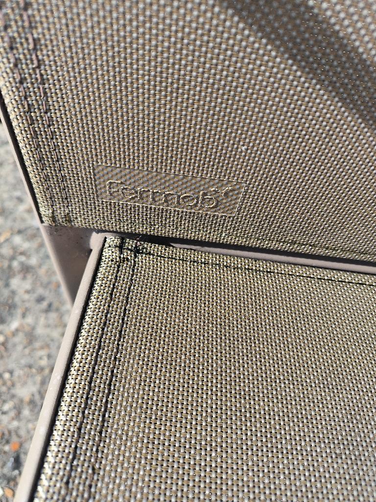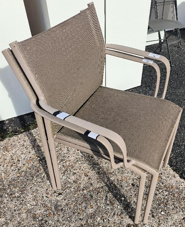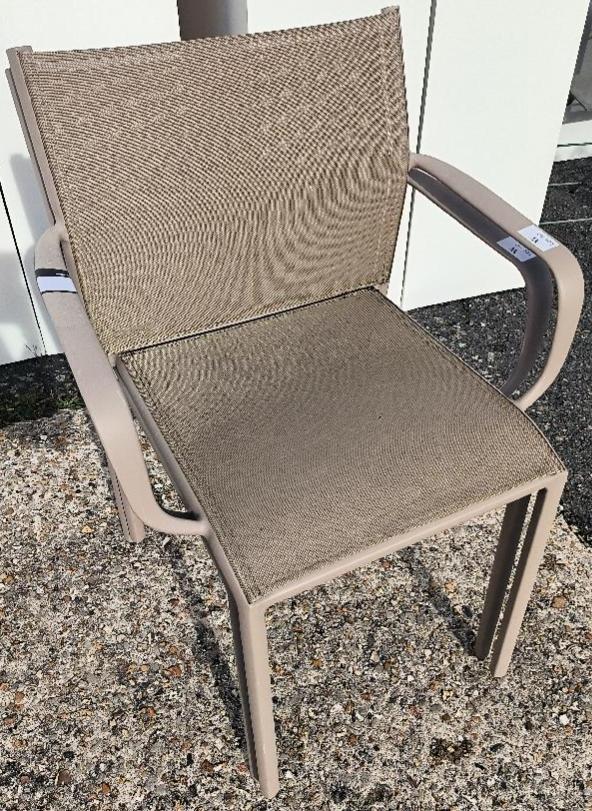 Fauteuil d’extérieur empilable de marque Fermob en métal couleur taupe, dossier et assise en tissu « OTF Batyline® ». Dim. : 89 x 56 x 53 cm. 4 unités. Vendu à l’unité avec faculté de réunion. Localisation : 30 rue Beauregard 60440 Nanteuil-le-Haudouin.