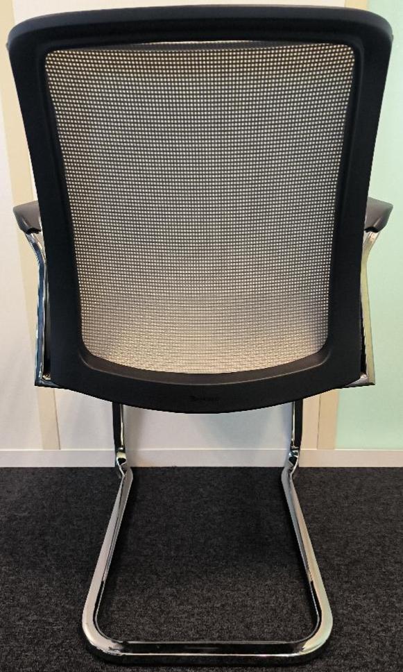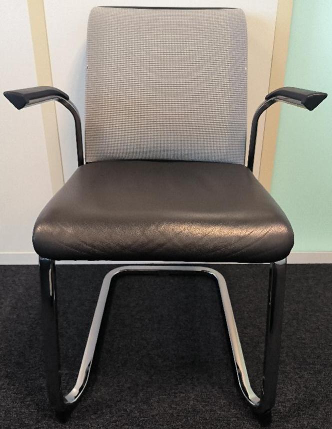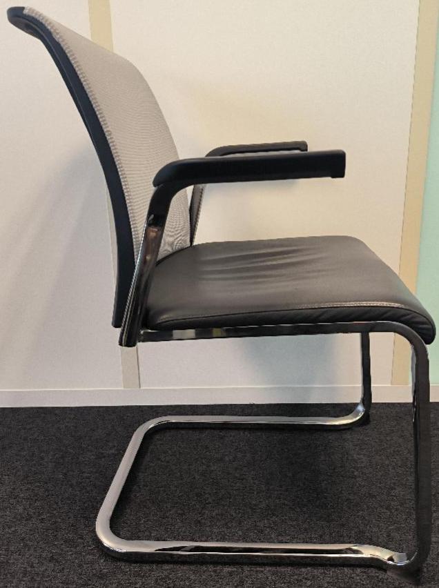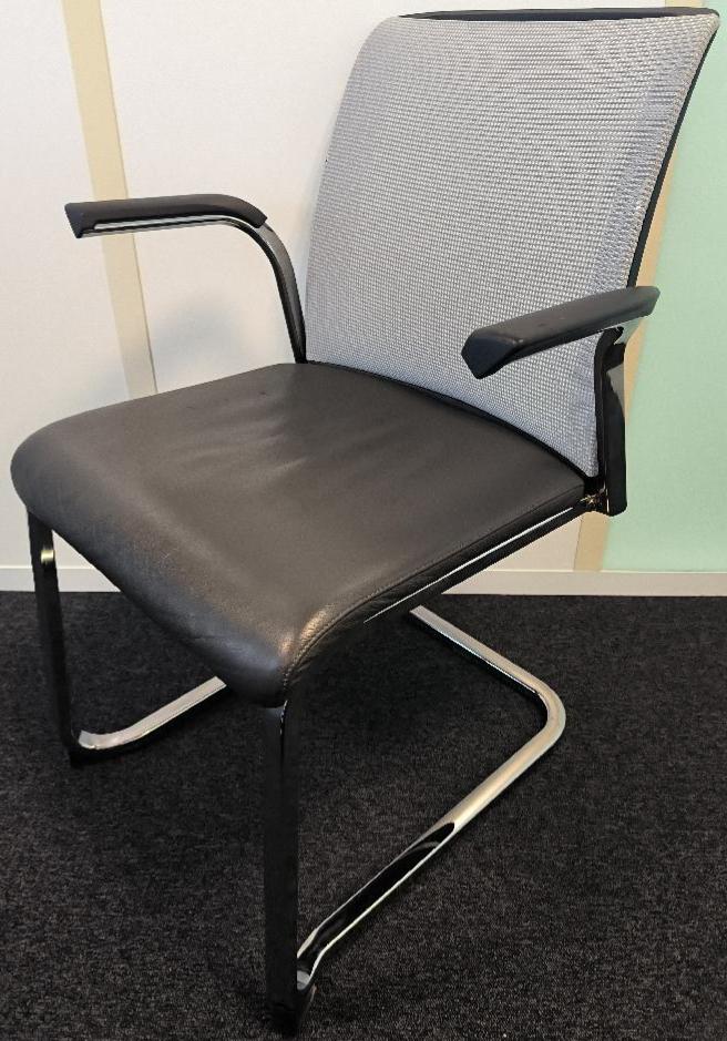 Fauteuil empilable de marque Steelcase, assise en cuir de couleur noir, dossier en résille de couleur gris, piétement porte-à-faux en métal chromé. Dim : 84 x 60 x 62 cm. 40 UNITÉS AU TOTAL. (étiquette 5025)
