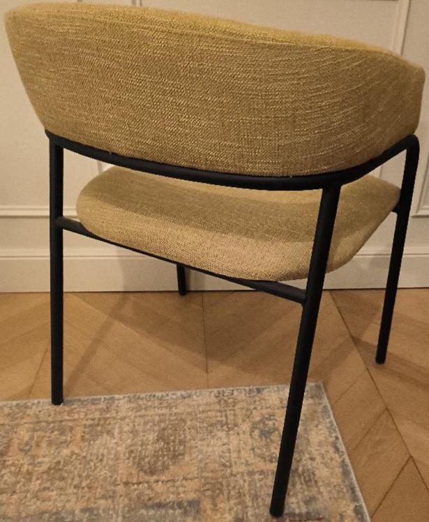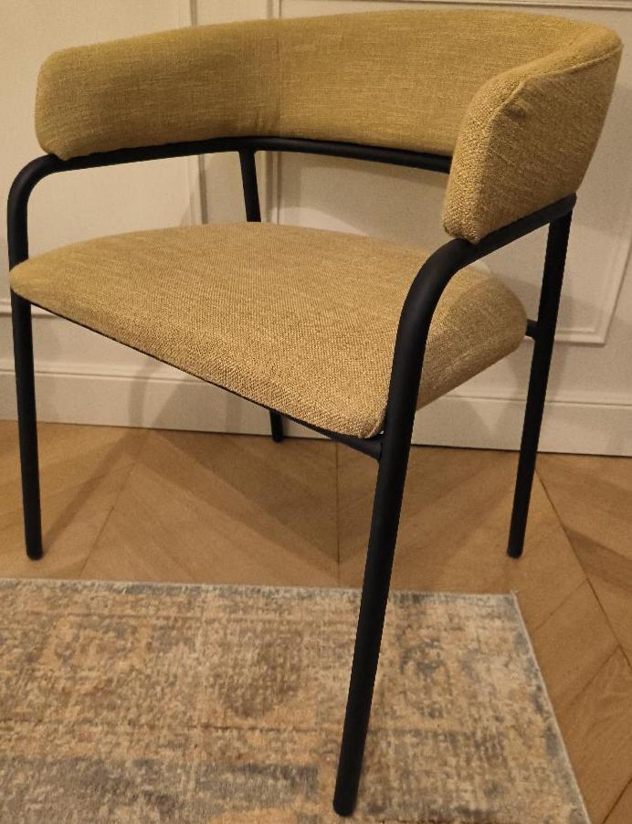 Fauteuil en acier laqué noir, assise et dossier en tissu de couleur jaune moutarde. Dim : 72 x 56 x 52 cm. Localisation: BLB, 3 rue de la Fossé aux Leux – 91700 Sainte Geneviève des Bois