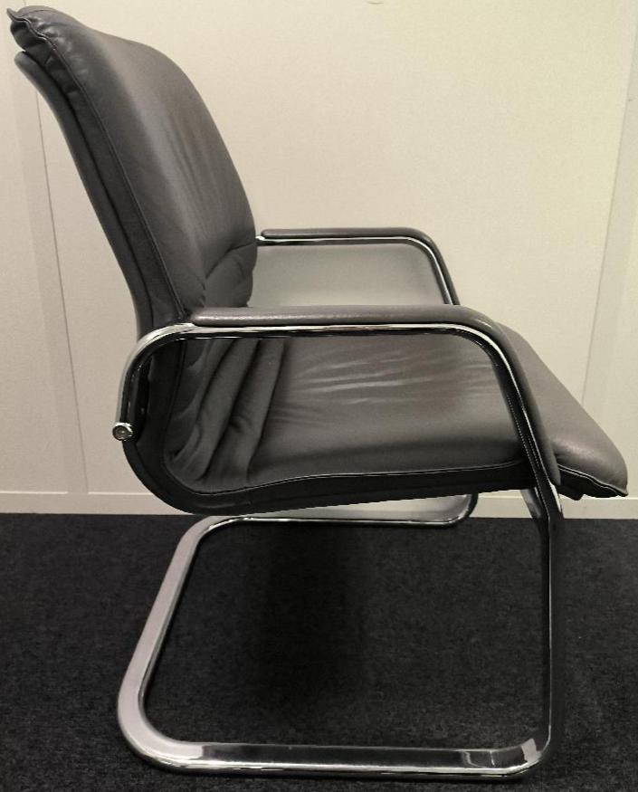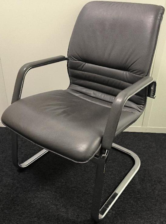 Fauteuil en cuir de couleur gris anthracite, piétement porte-à-faux en métal chromé, accoudoir gris anthracite. Dim : 88 x 58 x 70 cm. 1 UNITÉ AU TOTAL. (étiquette 5026)