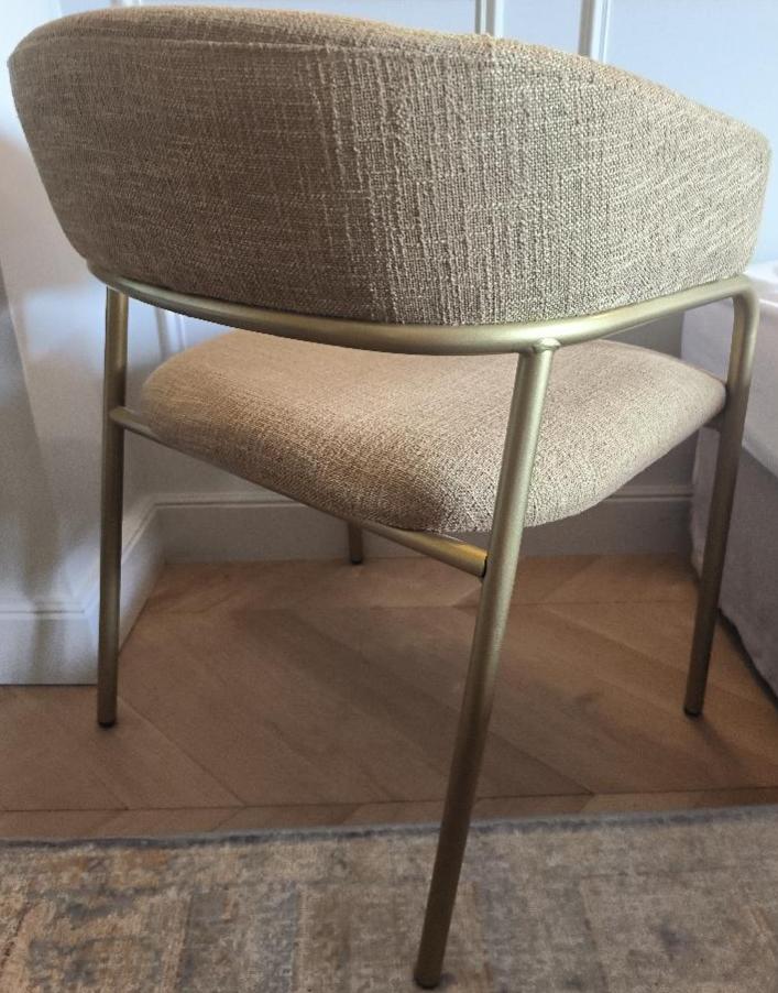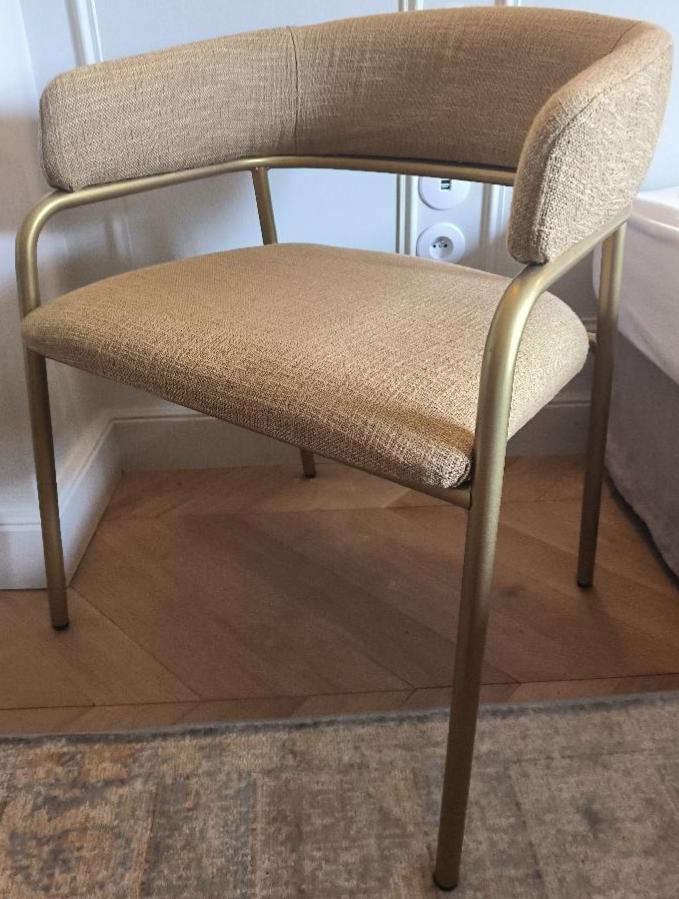 Fauteuil en métal doré, assise et dossier en tissu de couleur moutarde. Dim : 72 x 56 x 52 cm. 3 unités. Vendu à l’unité avec faculté de réunion. Localisation: BLB, 3 rue de la Fossé aux Leux – 91700 Sainte Geneviève des Bois