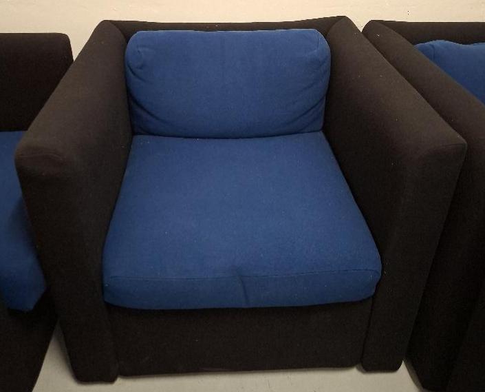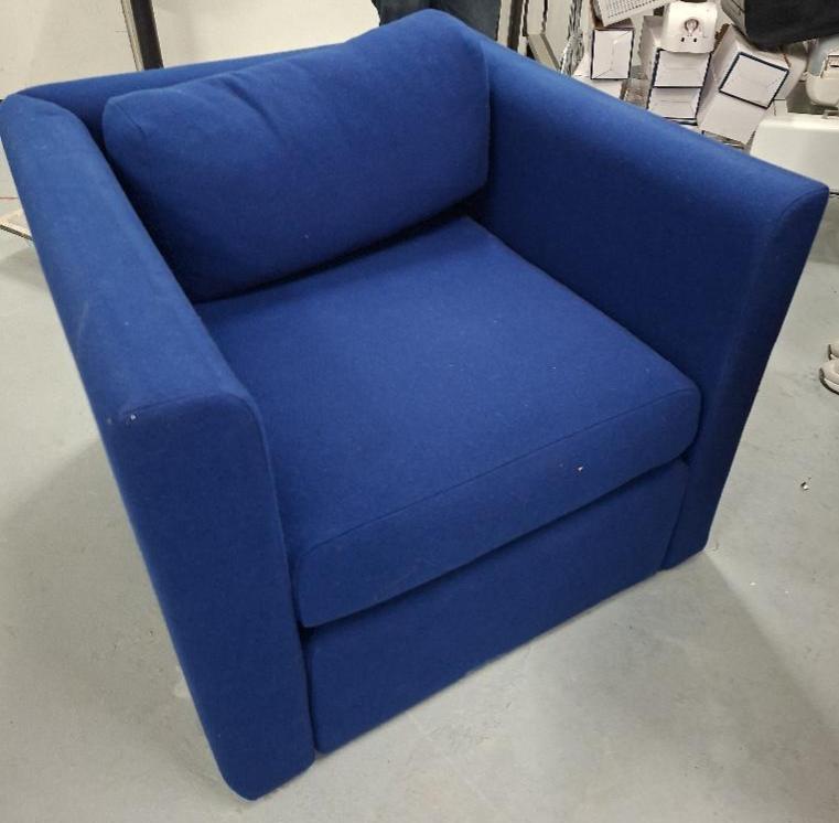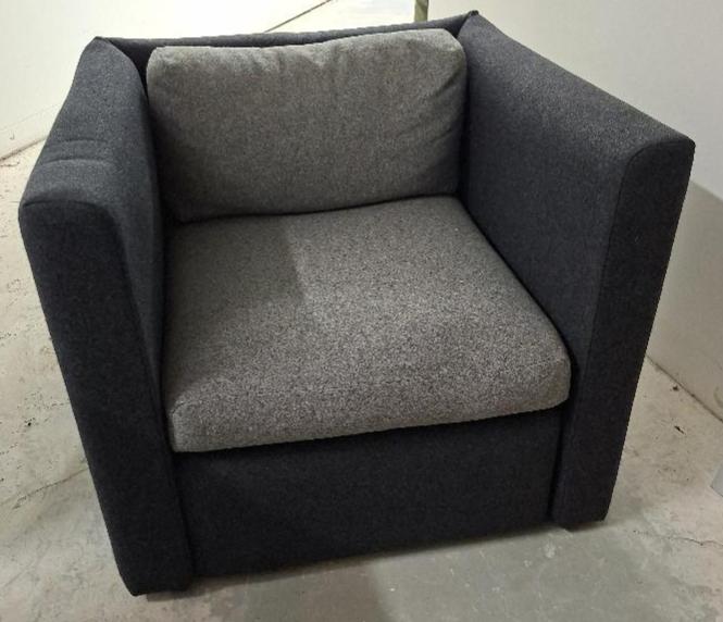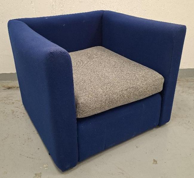 Fauteuil lounge de marque Hay recouvert de feutrine, coussin d’assise amovible, diverses couleurs dont bleu/bleu, bleu/gris, noir/bleu, noir/gris (taches). 73 x 93 x 90 cm. 12 unités. Vendu à l’unité avec faculté de réunion. Localisation: 5 rue des Italiens – 75009 Paris