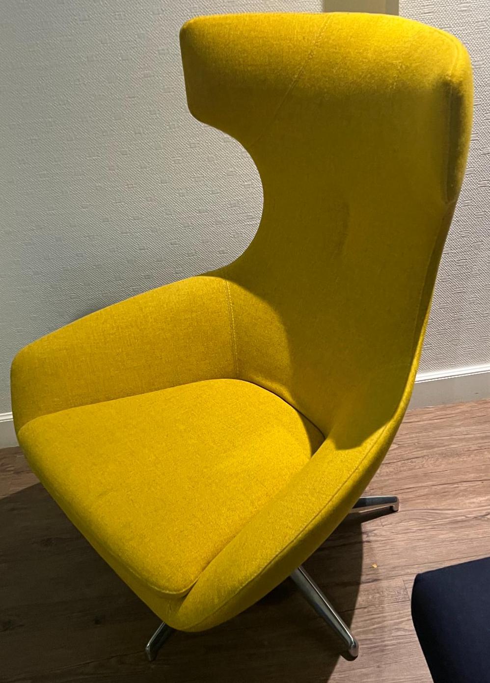 Fauteuil Lounge en tissu jaune, piètement chromé. Localisation: 30 rue Beauregard 60440 Nanteuil-le-Haudouin.