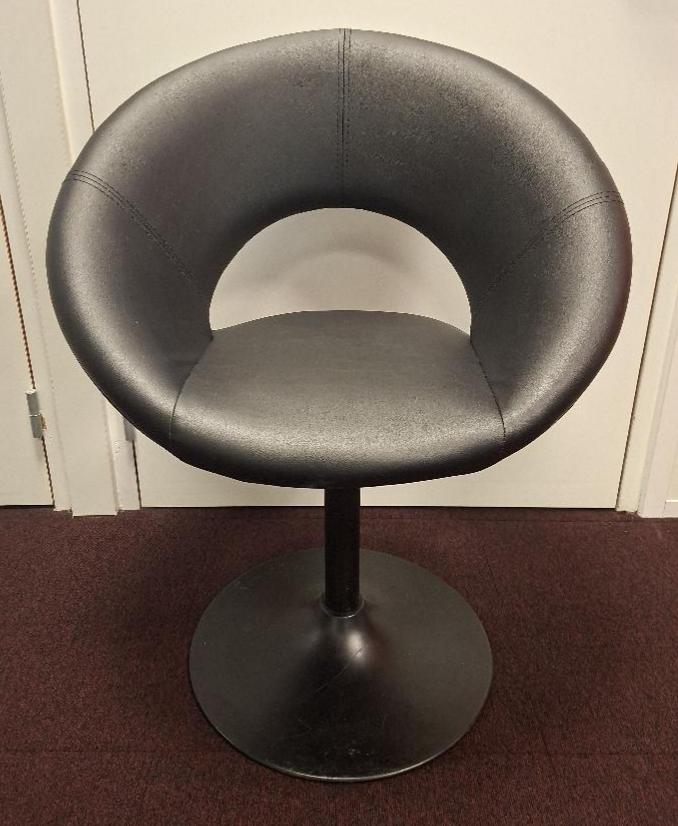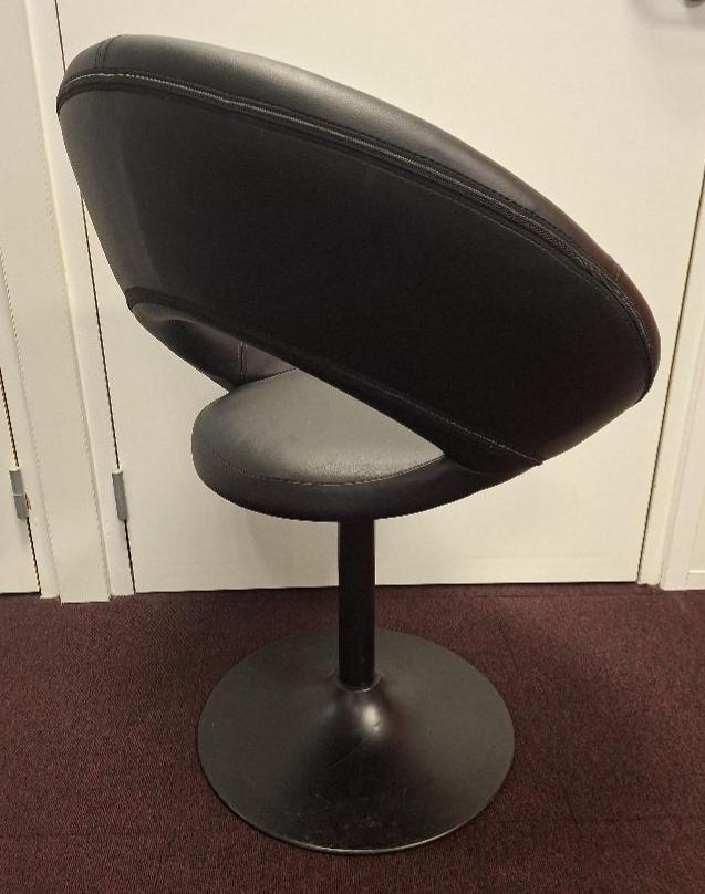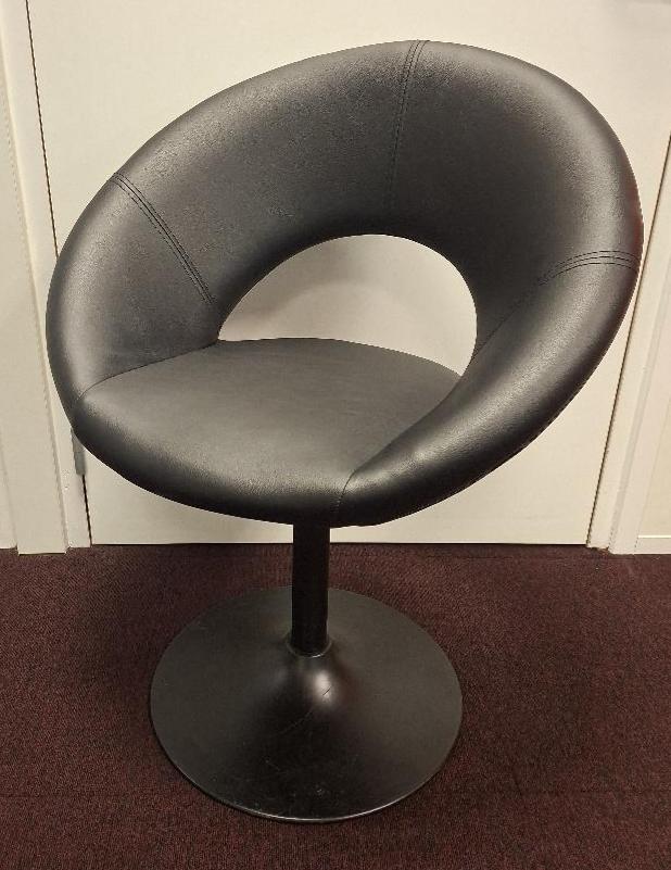 Fauteuil pivotant à coque ajourée recouverte de cuir noir, piétement colonne en acier laqué noir sur base circulaire. 86 x 66 x 55 cm. 8 unités. Localisation: 1er étage local BVP (4 unités) / Entresol bureau M. Caracalla (4 unités)