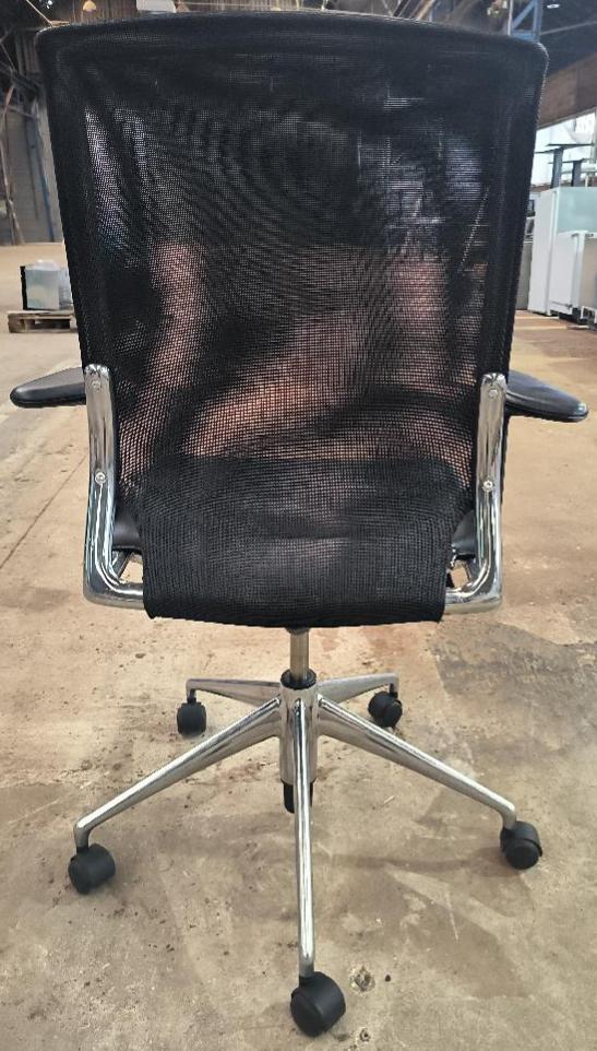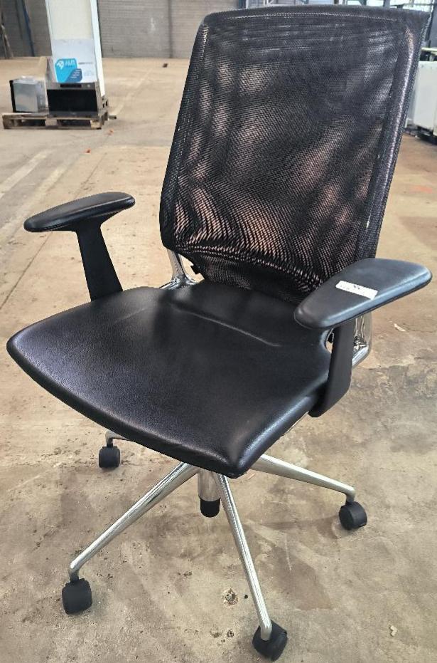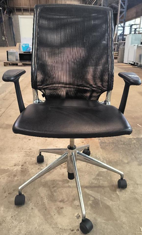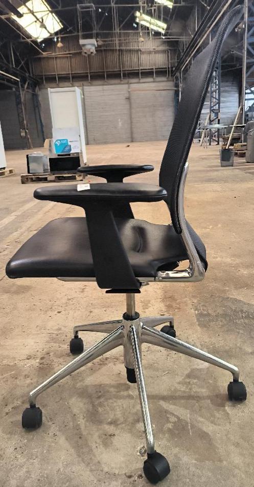 Fauteuil pivotant ajustable en hauteur design Alberto Meda modèle Meda Chair édition Vitra, structure en aluminium, dossier en resille noir, assise en cuir noir, piètement en étoile à 5 branches sur roulettes. Dim : 110 x 70 x 70 cm. Localisation : 34 avenue du Général Patton 02880 Crouy