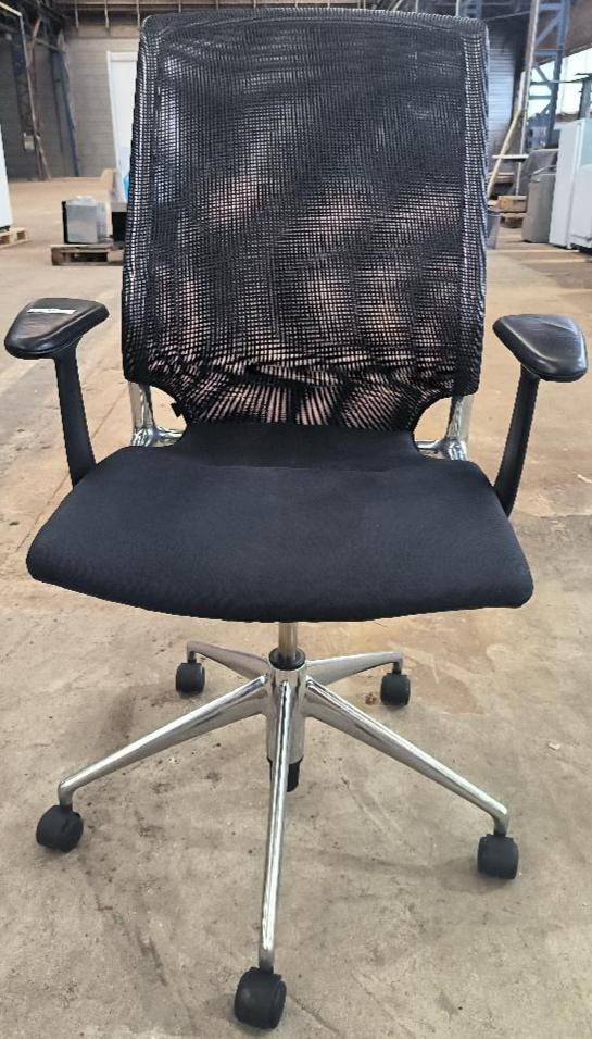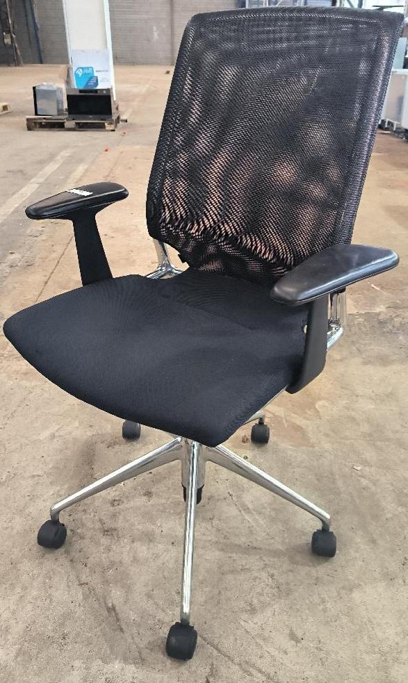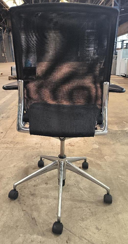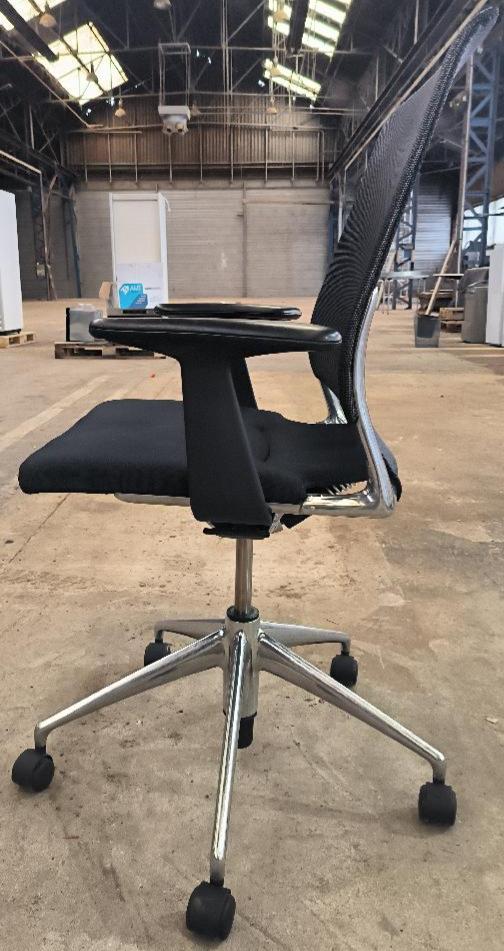 Fauteuil pivotant ajustable en hauteur design Alberto Meda modèle Meda Chair édition Vitra, structure en aluminium, dossier en resille noir, assise en tissu noir, piètement en étoile à 5 branches sur roulettes. Dim : 110 x 70 x 70 cm. Localisation : 34 avenue du Général Patton 02880 Crouy