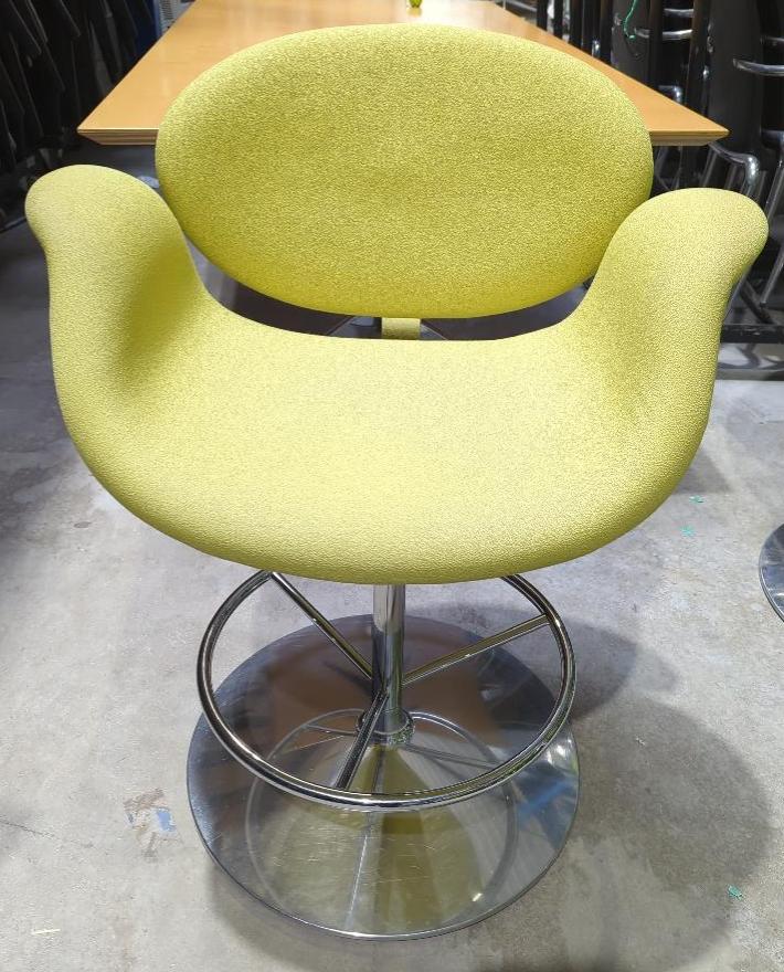 Fauteuil pivotant avec retour automatique design Pierre Paulin modèle Tulip édition Artifort recouvert de tissu jaune mimosa, piètement en acier chromé avec repose pieds. 90 x 70 x 57 cm. 4 unités. Vendu à l’unité avec faculté de réunion. Localisation: 38 rue de Lamirault – 77090 Collégien