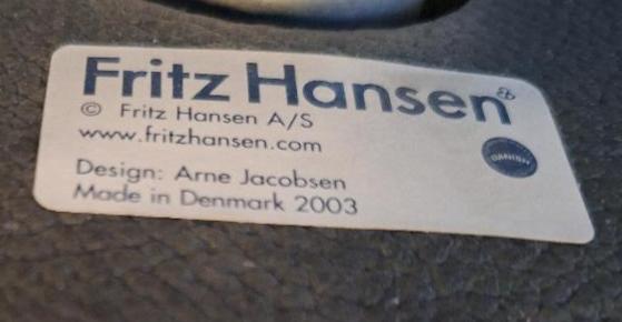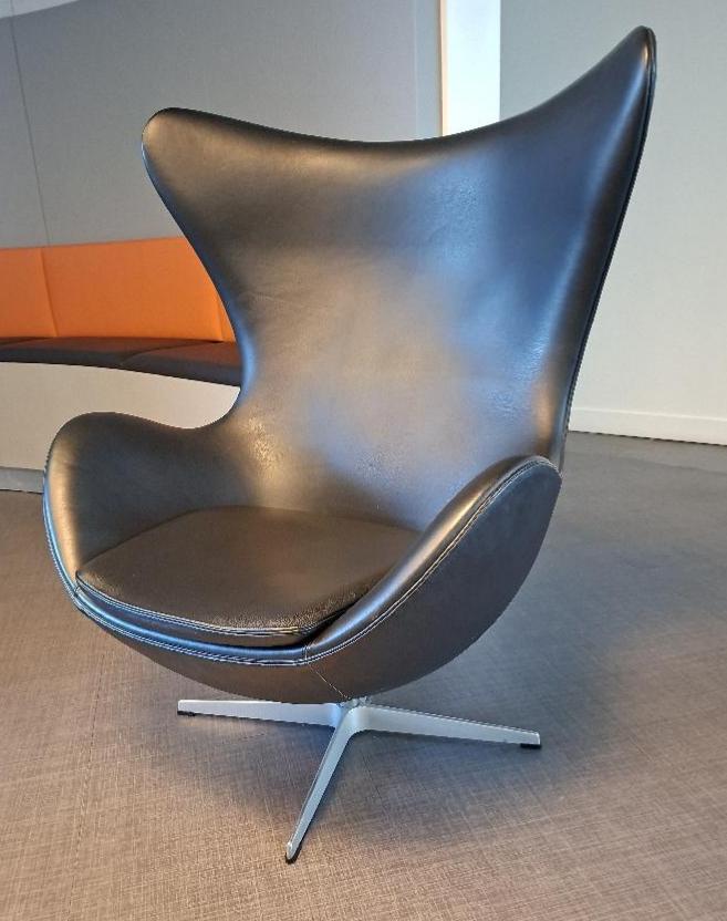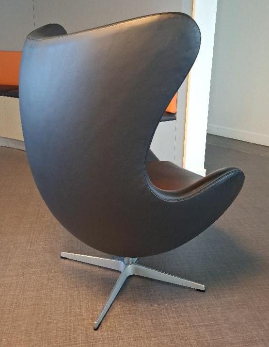 Fauteuil pivotant design Arne Jacobsen modèle Egg Chair édition Fritz Hansen recouvert de cuir noir, galette d’assise amovible, piétement en étoile à 4 branches en métal. 104 x 85 x 70 cm. 5 unités. Localisation: Accueil (3 unités) / Entresol local Ludothèque (2 unités)