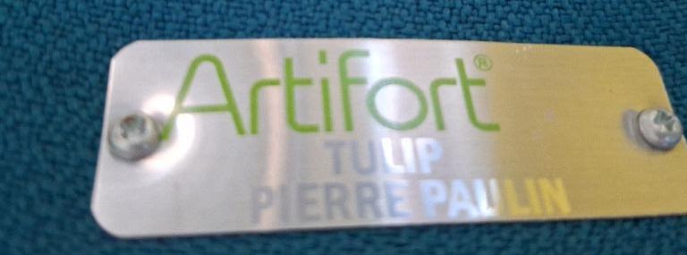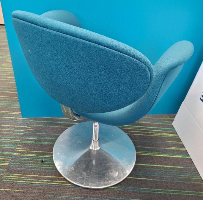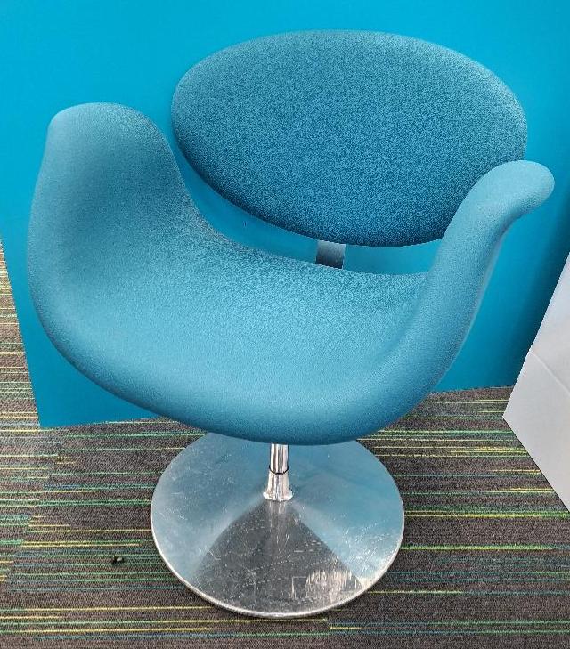 Fauteuil pivotant design Pierre Paulin modèle Tulip édition Artifort recouvert de tissu bleu sur base circulaire en acier chromé. 75 x 64 x 52 cm. 2 unités. Vendu à l’unité avec faculté de réunion. (rdc). Localisation: 10 rue d’Arcueil – 94150 Rungis