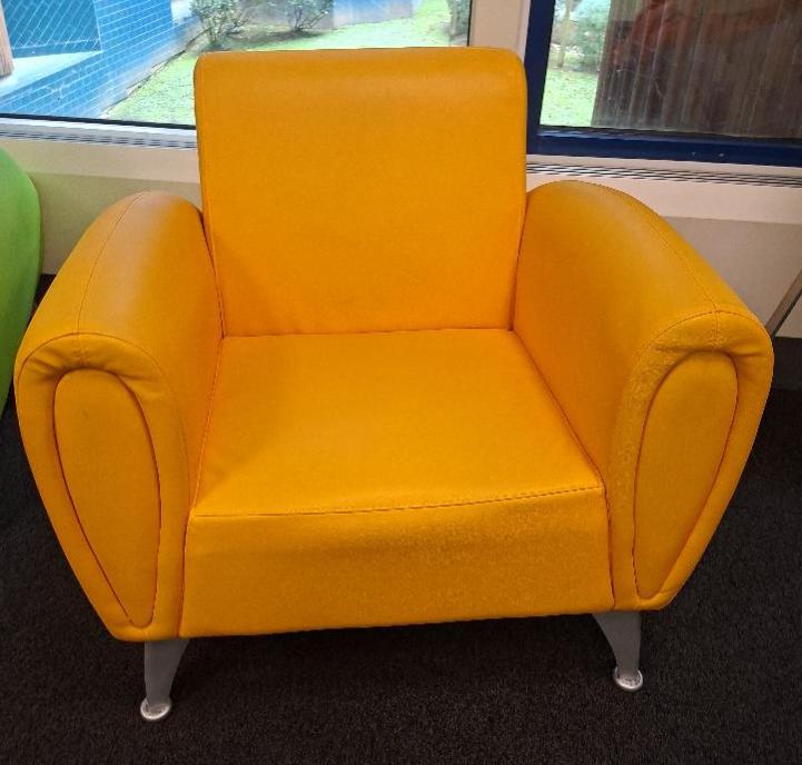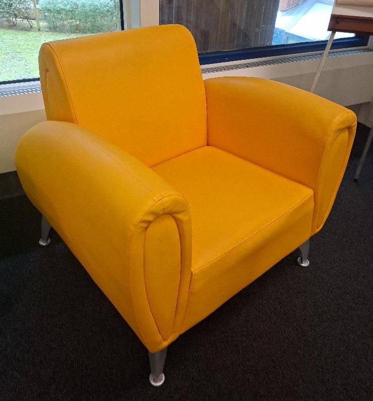 Fauteuil recouvert de cuir jaune poussin, 4 pieds en métal. 80 x 82 x 84 cm. 1 unité. Localisation: café codir