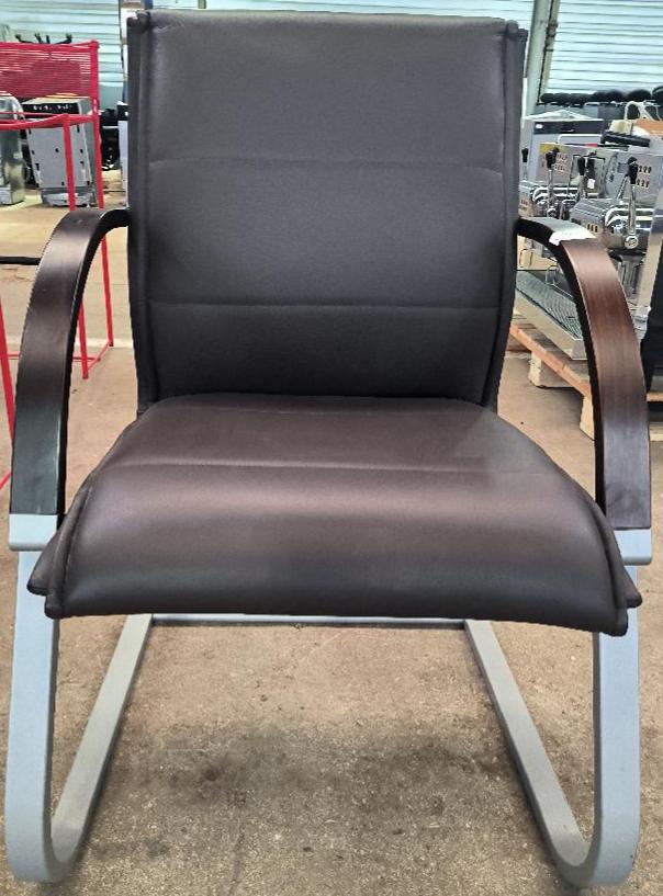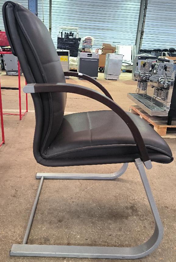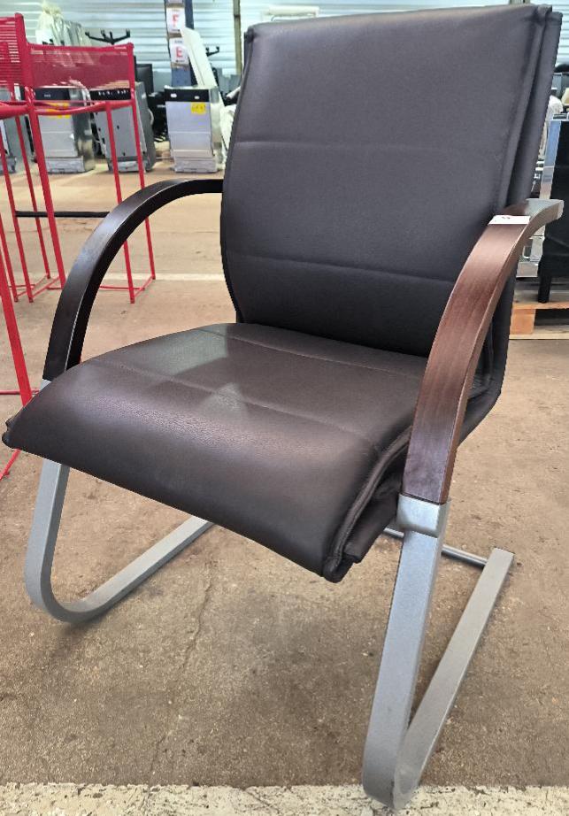 Fauteuil recouvert de cuir marron, accoudoirs en bois de couleur chêne, piétement porte-à-faux en métal de couleur gris clair. Dim : 94 x 62 x 60 cm. Localisation : 34 avenue du Général Patton 02880 Crouy