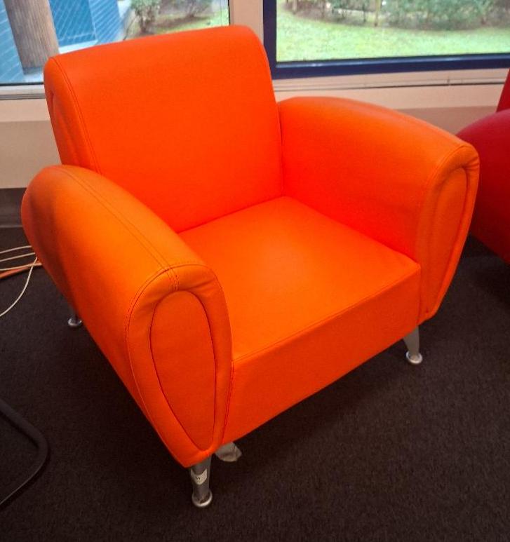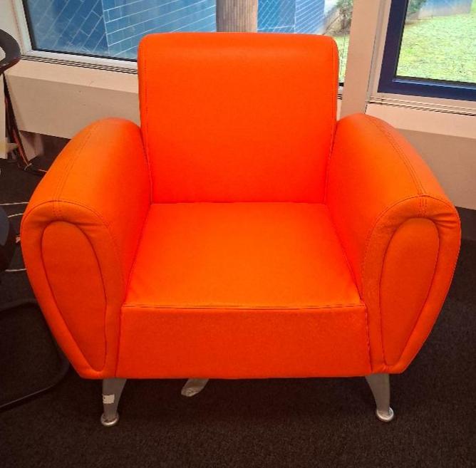 Fauteuil recouvert de cuir orange, 4 pieds en métal. 80 x 82 x 84 cm. 1 unité. Localisation: café codir
