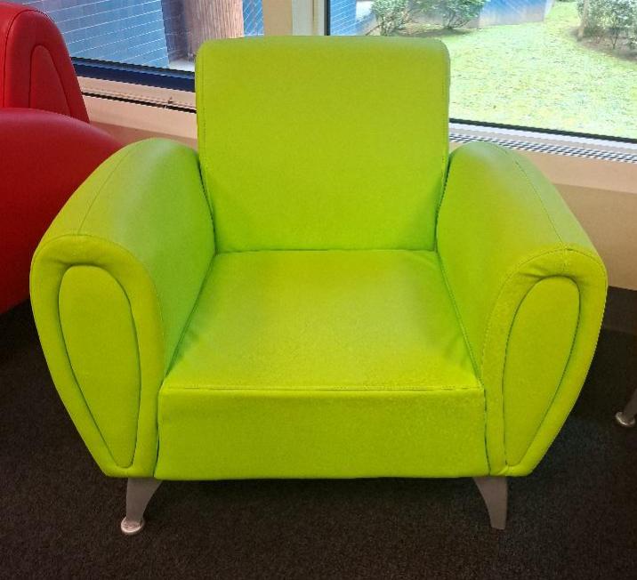 Fauteuil recouvert de cuir vert pomme, 4 pieds en métal. 80 x 82 x 84 cm. (manque 2 patins). 1 unité. Localisation: café codir